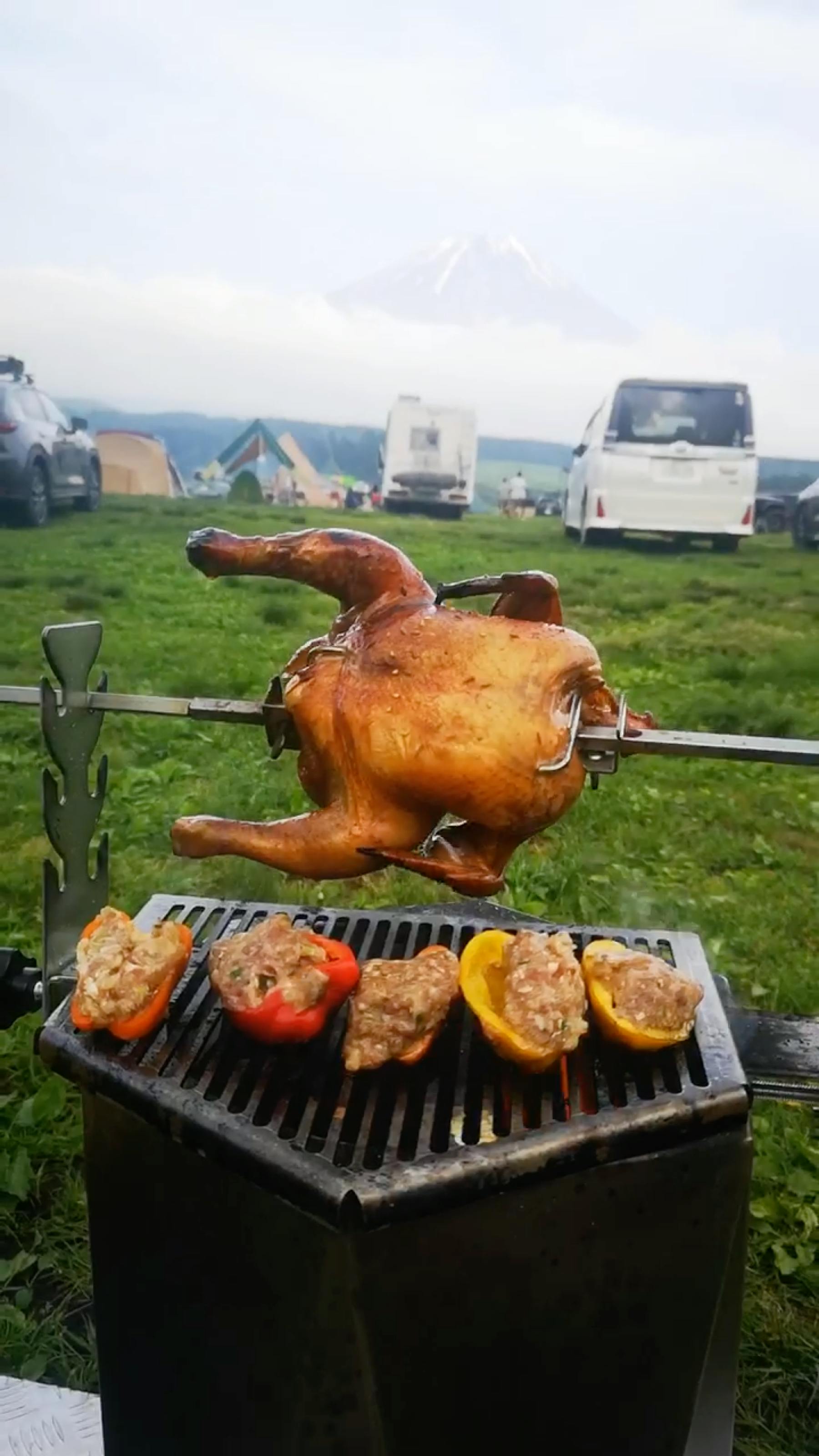 回転式ロースターを取り付けて鳥の丸焼きをしましたら、大注目で声を掛けていただきました。火おこしで松明の様な炎を楽しんだ後に炭火で安定した調理が出来ます。