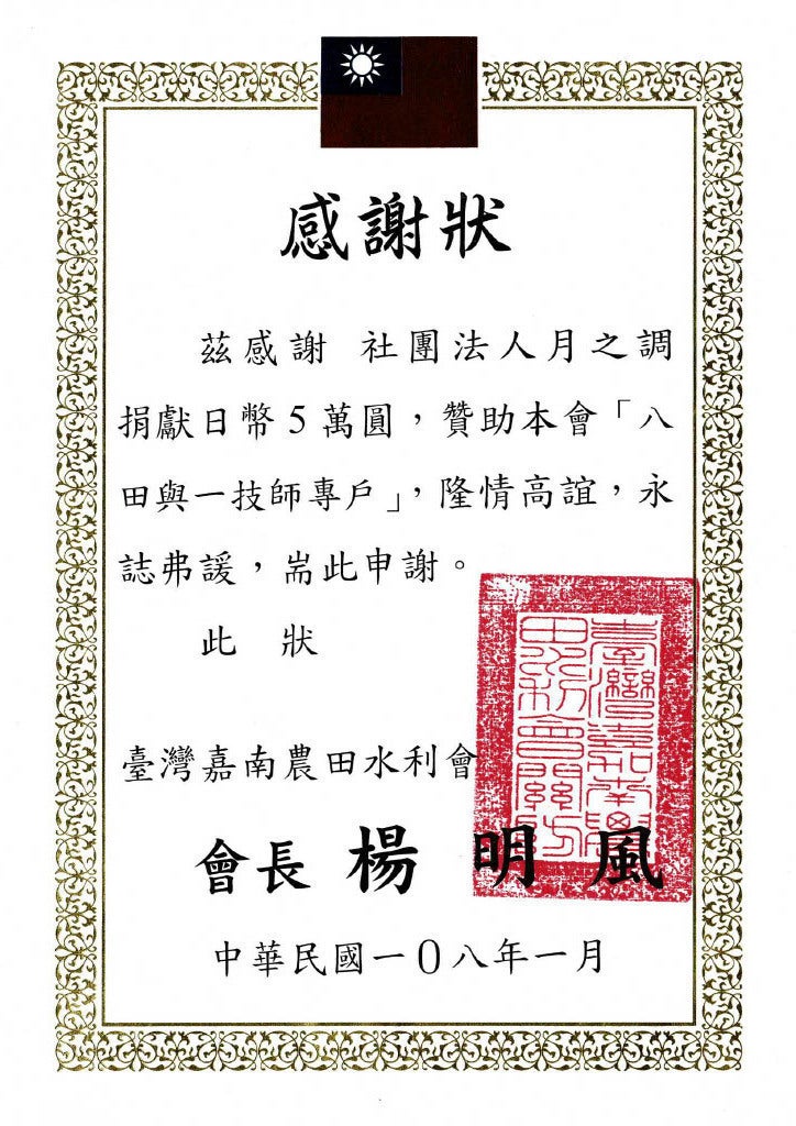 2017年~2019年 八田與一追悼公演および台湾への寄付開始。3回感謝状を賜る。