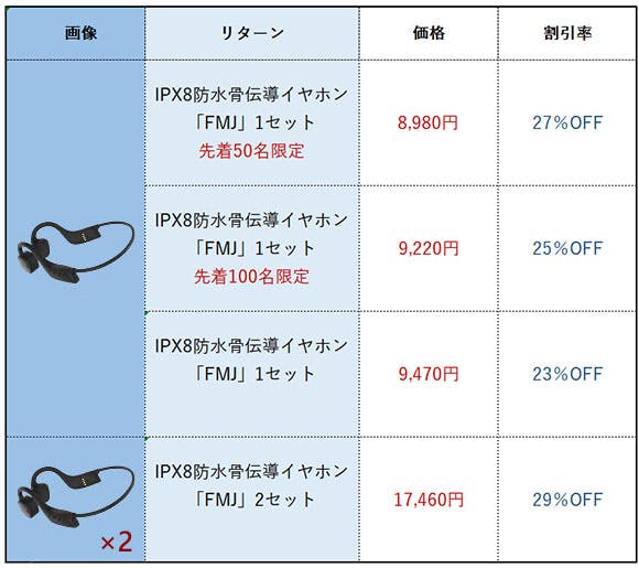 2022/05/19 11:38ご支援者の皆様この度は、骨伝導イヤホンFMJにご支援頂きまして、誠にありがとうございます。大変お待たせいたしました!全てのリターン商品の発送を完了致しましたのでご報告させて頂きます。商品宅配業者:ヤマト運輸(一部の地域は佐川急便)皆様をお待たせして大変恐縮ではございますが、お住いの地域によっては2〜7日かかることもございます。商品がお手元に届くまで今しばらくお待ち頂けますと幸いです。万が一、本日より7日以上経っても届かない場合はお手数ですがメッセージ送信をお願いいたします。改めまして皆様には本プロジェクトに最後までお付合い頂き、大変感謝申し上げます。今後とも末永くご愛顧賜りますようよろしくお願い申し上げます。 もっと見る【御礼】プロジェクトが終了しました!