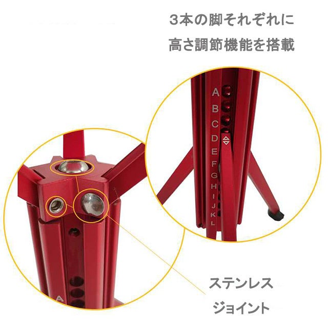 高さは12段階調節ができ、3本の脚位置を調整することで角度も変えられるため、食事をしたり、星空を眺めたりなどいろんなシーンでフィットします。