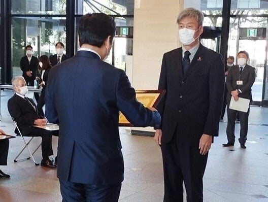 - <佐賀県知事から感謝状を受ける岡事務局長>