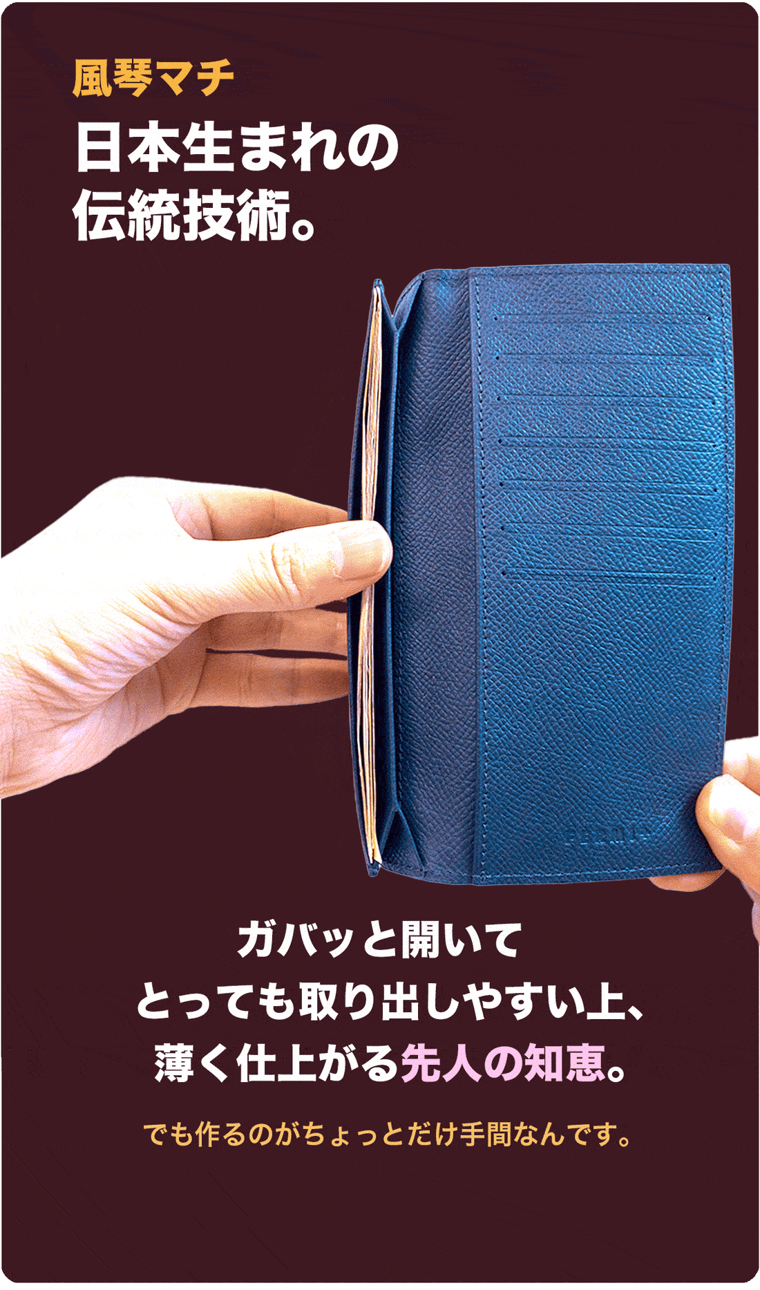 一枚革の構造で裏地のないタイプのお財布は、長期間使用するとよれやすくボロボロ毛羽立ってきっと後悔しちゃいます。クラウドファンディングのお財布の中には工賃や材料費・サイズを抑えるために一枚革で仕立てるお財布も多いですが、長く使うお財布には見えない裏側部分の構造がとっても大事なんです。