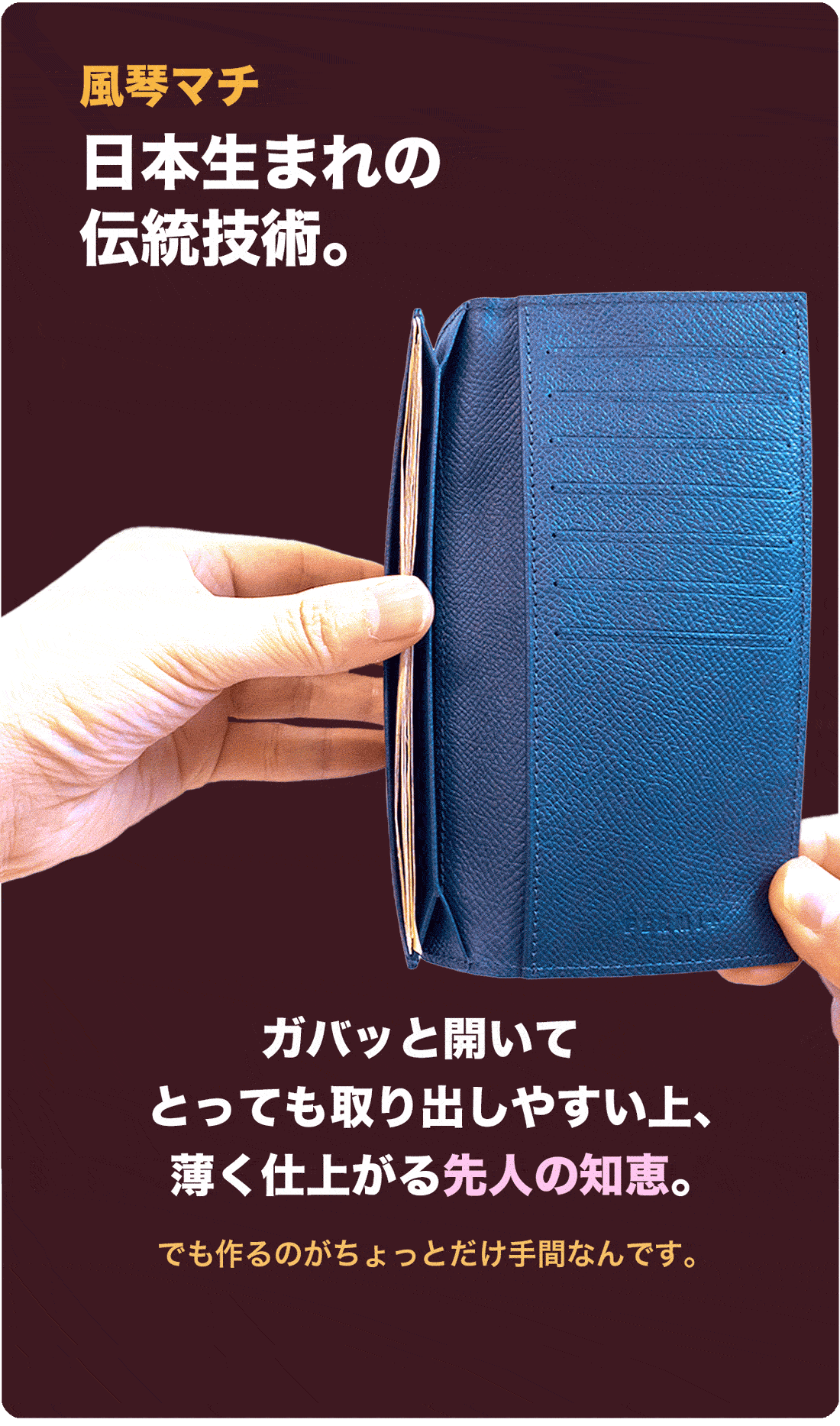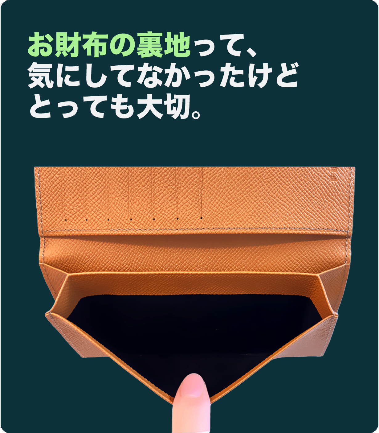 一枚革の構造で裏地のないタイプのお財布は、長期間使用するとよれやすくボロボロ毛羽立ってきっと後悔しちゃいます。クラウドファンディングのお財布の中には工賃や材料費・サイズを抑えるために一枚革で仕立てるお財布も多いですが、長く使うお財布には見えない裏側部分の構造がとっても大事なんです。