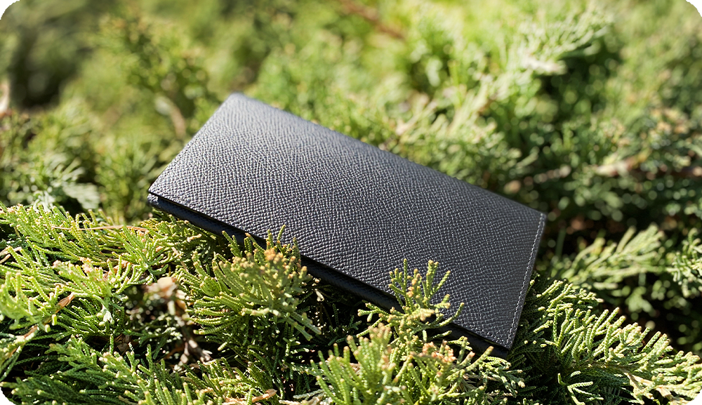 品のあるマットよりの半光沢のブラックカーフ。ビジネス・カジュアル問わずどのシチュエーションにも馴染み、使うごとに自然と深みを増す最高級のブラックレザーです。見比べた時に一番差のわかる色だからこそ妥協しない品質で、他のどんなブラックレザーの財布と並んでも見劣りのしない品質を保証します。