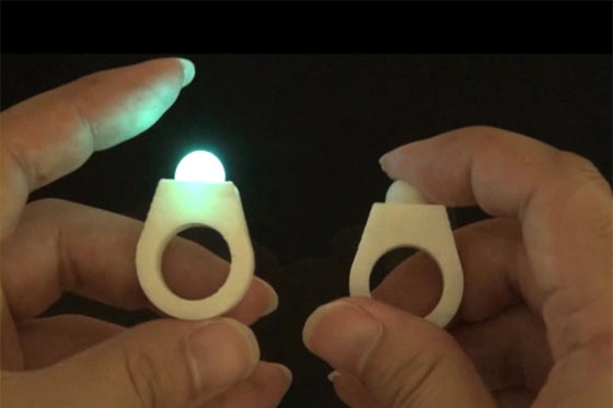 この指輪型デバイスを使えば、どんなに離れていても恋人や家族に「指を握っている」感覚を伝えることができます。
