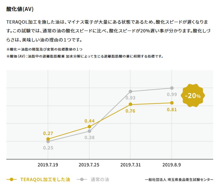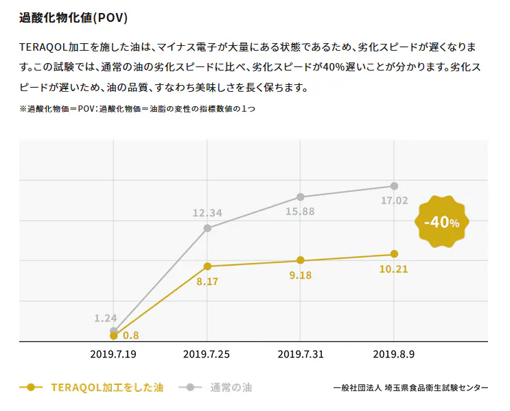 ③TERAQOL®によりマイナス電子が豊富な状態となるため、酸化を還元するために加熱しても酸化しずらく、冷めても美味しさを保ちます。