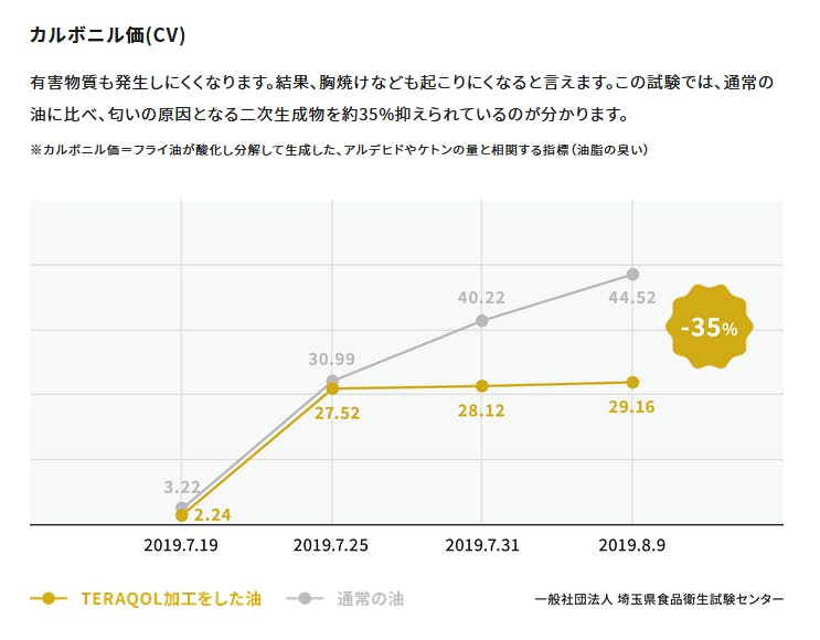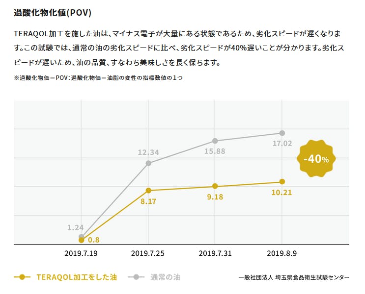 ④レゾナンスオイルは原料からこだわり、一切の化学薬品を使用せず製造しているので、動画の中のカルボニル価などの毒性物質の減少の説明はあてはまりませんが、一般的な化学物質を使用して製造した油をTERAQOL®で改質すると、それらの毒性物質も減少させることができます。