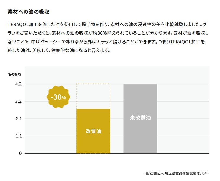 通常は、突沸といって水分が衣を突き破って油のほうに出てくるため、油が跳ねる現象が起こります。 TERAQOL®のキープフレッシュ製法を施した油は衣が割れず、食品中の水分、イコールうまみ成分を逃さない状態を作ることができるので、美味しいだけでなく、衣が水分を吸ってべっとりすることも少なく、表面はサクサク、中はジューシーで冷めても美味しい仕上がりとなります。