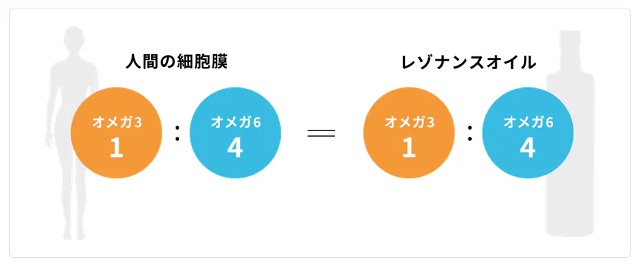 レゾナンスオイルは、人間の細胞膜の脂肪酸と同じオメガ3「1」に対し、オメガ6「4」の配合バランスで生成されています。