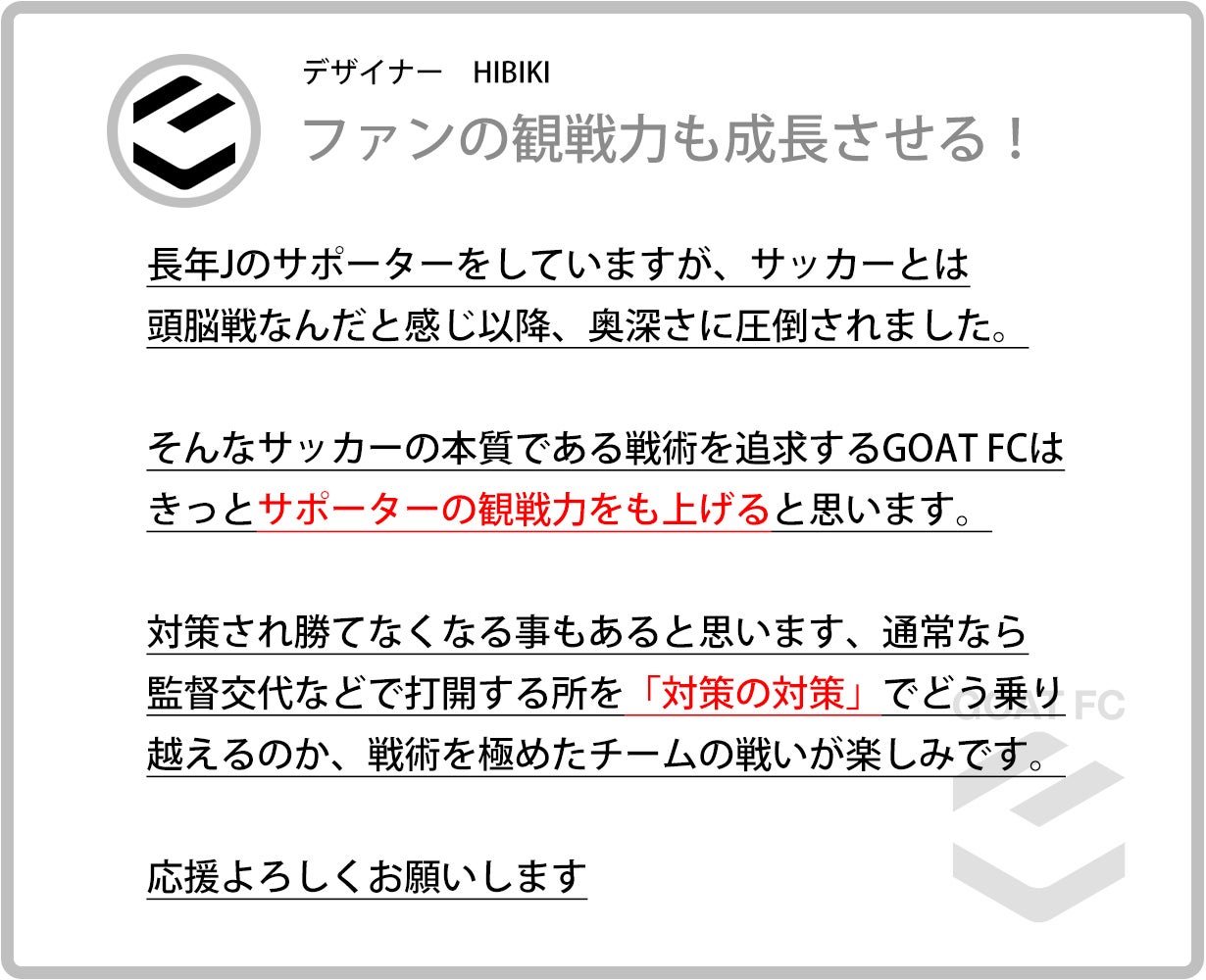 戦術を取り扱う動画を日々配信していたある日、視聴者様の「いつかGOAT FCを作ってください!」という一言に、私の諦めかけていた夢を思い出し「追いかけてみたい」と思い、チャンネルにて選手募集を開始いたしました。