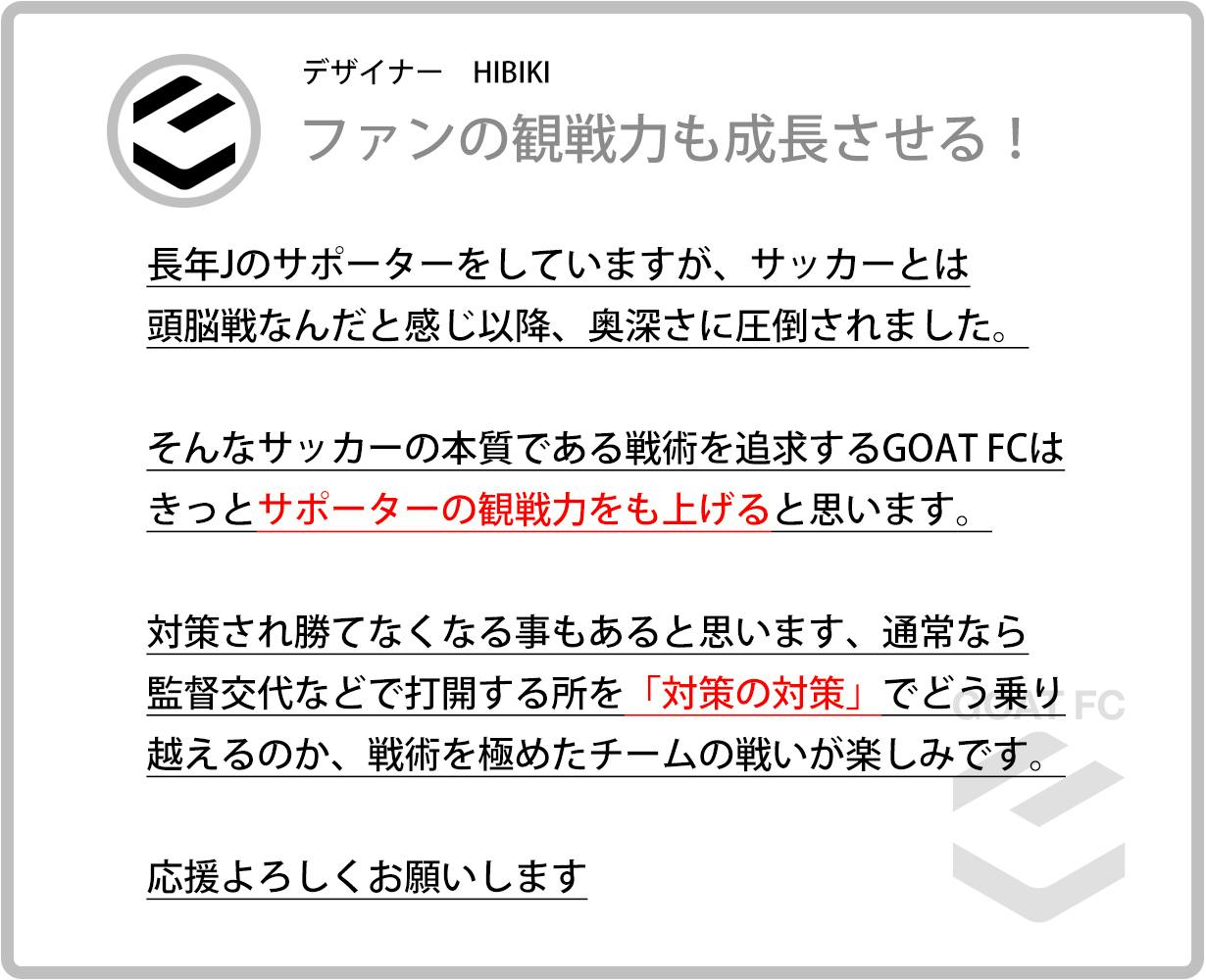 戦術を取り扱う動画を日々配信していたある日、視聴者様の「いつかGOAT FCを作ってください!」という一言に、私の諦めかけていた夢を思い出し「追いかけてみたい」と思い、チャンネルにて選手募集を開始いたしました。