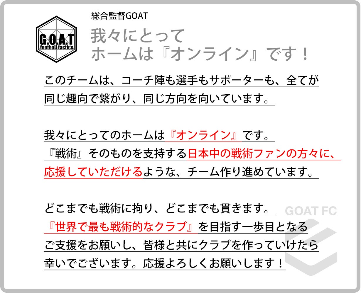 戦術を取り扱う動画を日々配信していたある日、視聴者様の「いつかGOAT FCを作ってください!」という一言に、私の諦めかけていた夢を思い出し「追いかけてみたい」と思い、チャンネルにて選手募集を開始いたしました。