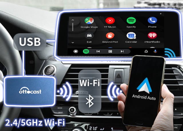 「OTTOCAST U2-X」には2.4/5GHz二つのWi-Fiモジュールが搭載されており、 どちらの周波数でスマホと接続してもAndroid Autoの無線接続が利用できるので、これまでで最も速くかつスムーズなCarPlay/Android Autoエクスペリエンスを提供します。