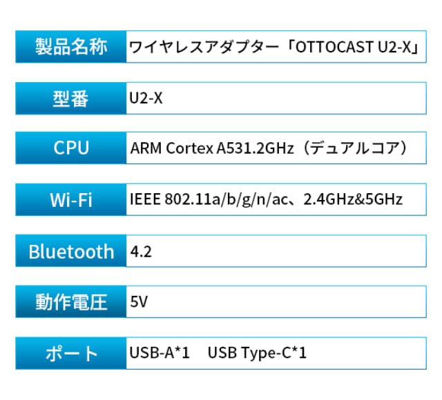 A 「OTTOCAST U2-X」のAndroid Autoへの対応は有線CarPlayシステムを通して行われているから、Android Autoシステムのみ対応した車は本製品をご利用いただけません。