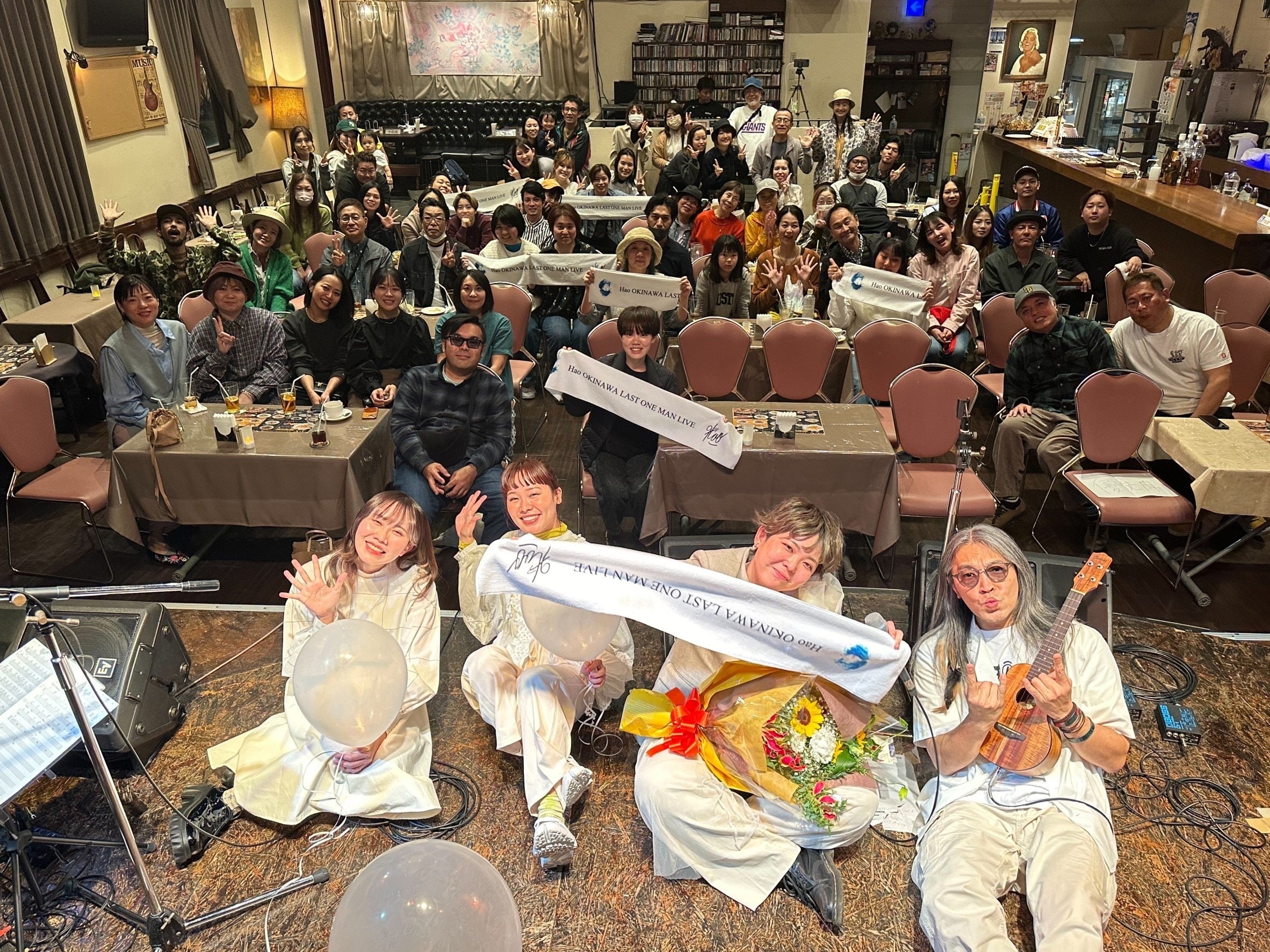 2024/03/24 20:15クラウドファンディングをご支援してくださった全ての皆さまへシンガーソングライターHaoです。街のあちらこちらで春のこえがするこの頃。無事に沖縄ラストワンマンライブを終えることができました。こうして開催することができたのは本当に皆さんのおかげです。改めて、ありがとうございました。今回、ステージを白の風船で飾りつけ、衣装も白、楽器のサポートメンバーも白の衣装、スタッフも白と隅々まで思いをのせてこだわることができました。その白になぜこだわったのかというと白はいろんな色に染まるからです。私は今後東京人生を通して、いろんな価値観、経験に触れていきたいと感じています。いろんな色を吸収していき、それを自分自身にしていく。その前向きな思いから今回このようなステージづくりをしました。(ライブ中にはこんなにまとまって話せず突っ込まれまくりましたが(笑))全13曲。沖縄で大活躍する先輩方に支えられ、1曲、1曲、歌うことができました。このライブを通し、シンガーソングライターHaoの集大成、東京に拠点をうつすという覚悟、そして今まで応援してくれた皆さんへ感謝の想い全てを伝えることができました。本当に本当にありがとうございました。残りのクラファンリターンにつきましても順次、また配送を再開させていただきます。大変長らくお待たせしてしまい申し訳ありませんが宜しくお願い致します。 もっと見るTシャツ、帽子、タオルをリターンのみなさまへお知らせ
