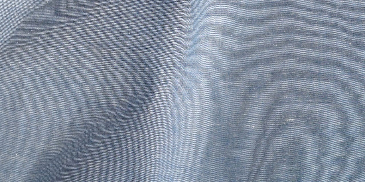糸の打ち込み本数が多い薄手のシャンブレー生地は、綿100%でありながら上品な光沢感もあります。爽やかなライトブルーで涼しげな質感が感じられます。