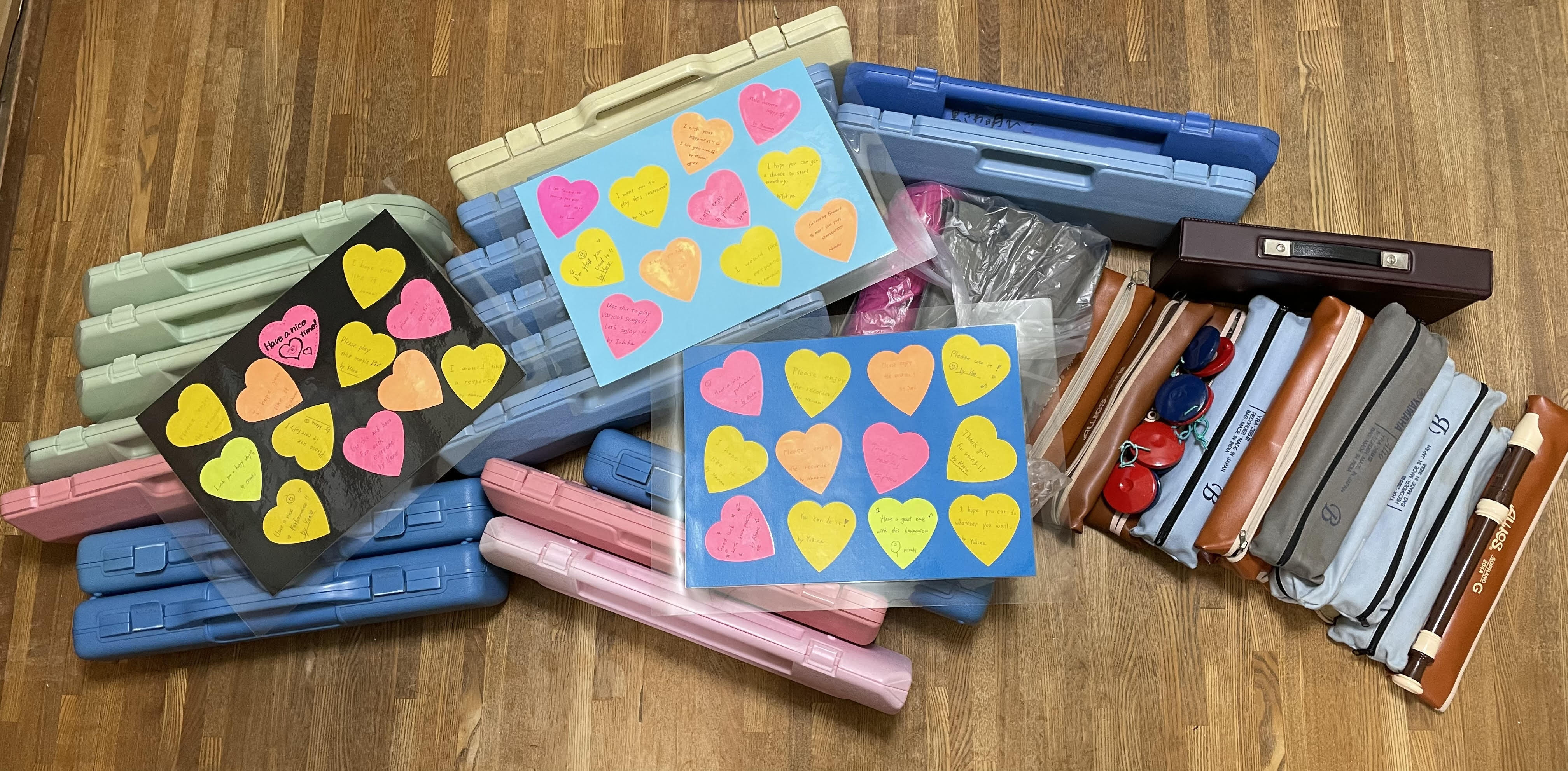 鍵盤ハーモニカ10台、ソプラノ・リコーダー、アルト・リコーダーを日本で購入して現地に郵送。