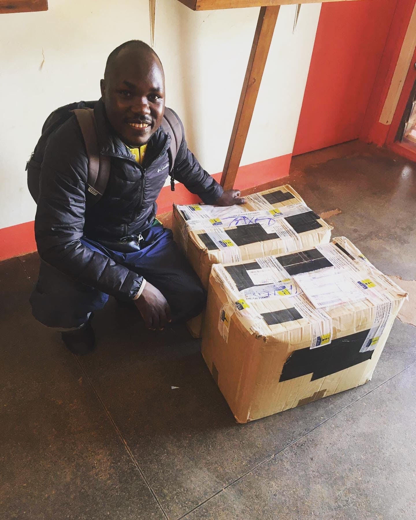 ウガンダの郵便局に届いた楽器を受け取ったポールさん。