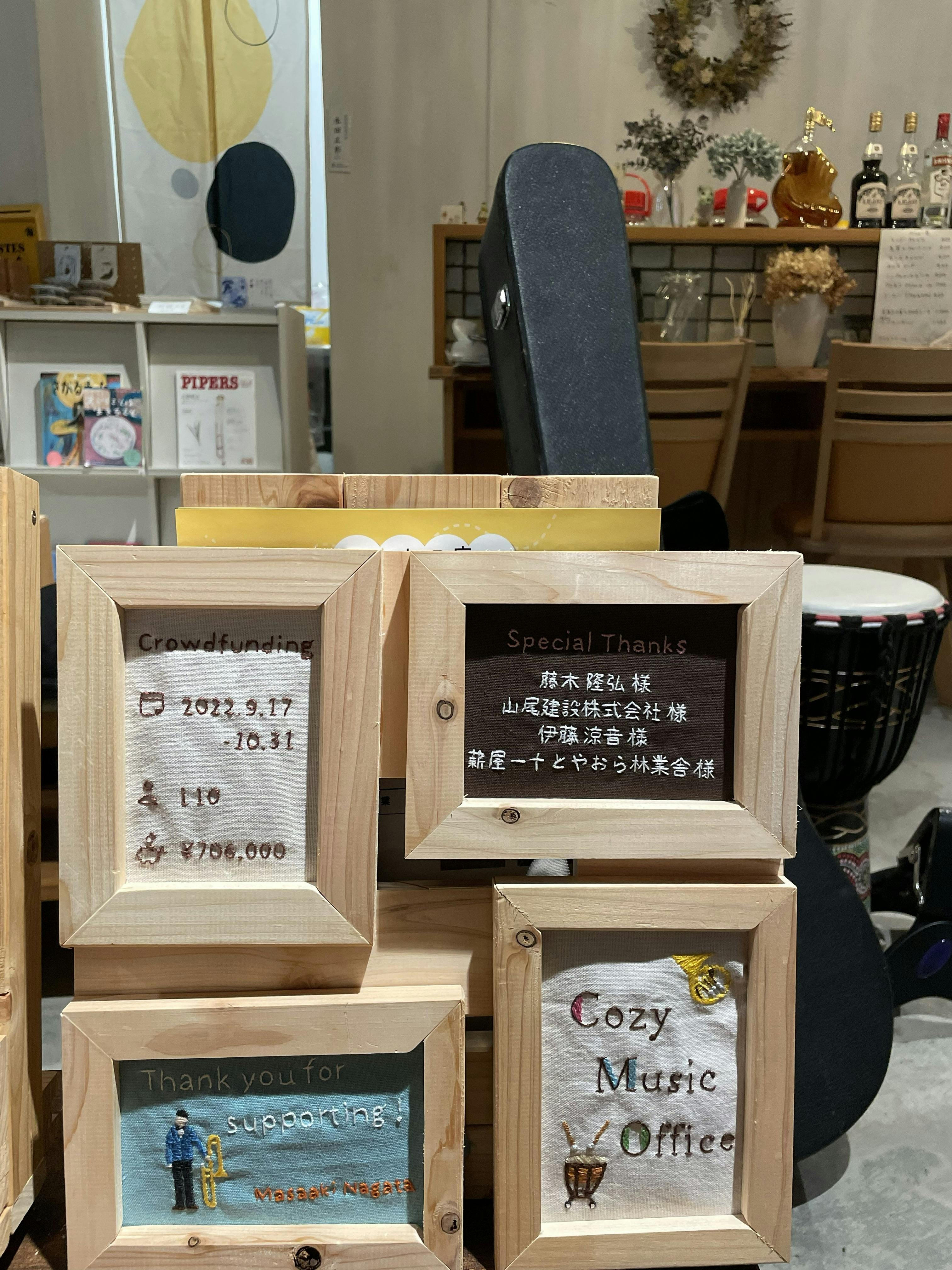 2026/03/11 16:02皆さん、こんにちは!このクラウドファンディングを行ったのが2022年冬でした。その際にはご協力を頂きありがとうございました。店舗(音楽交流サロンおとのわ)の工事が始まったのが約1年後2024年2月~3月頃でした。そのあとに飲食店営業許可などの申請を済ませて2024年9月1日にオープンしました。当日は仲間の演奏家を呼びコンサートを行いました。そして2025年9月には1周年記念のコンサートを行いました。詳細はコチラに投稿しております(インスタグラム)https://www.instagram.com/oto_no_wa_since2024/クラウドファンディングのサンクスボードを店内に設置いたしました(写真参照)枠は私が作り、刺繍は大阪在住の友人に作っていただきました。お時間ある方はぜひ音楽交流サロンに一度お越しください。定期的にイベントを開催しております。また時々、手作りお菓子も作っています。リターンでお送りしていたクラフトビールはコチラでも販売中です。今月末には新しい種類のビールの販売も始まります。 https://cozyshop.base.ec/items/78637658それではまた何かあればご報告いたします。皆さまお体に気を付けてお過ごしください。失礼いたします。2026.3.11 COZY MUSIC OFFICE 永田正彰 もっと見る