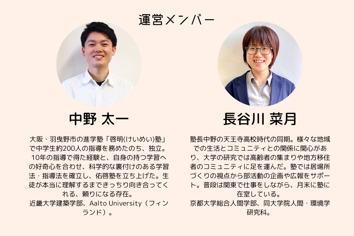 私は父の転勤の都合で、松原で中学2年から大学3年までを過ごしました。転校生の私は人間関係をうまく構築できず・・・今振り返っても当時はとてもしんどい時期で、家族にもたくさん迷惑をかけてしまいました。塾にも通わず、友達も少なかったので、家と学校以外に行くところが無かった、他に居場所があればもう少し楽に過ごせていたのかもしれない。そんな気持ちもどこかに持ちながら、佑啓塾の活動を手伝っています。