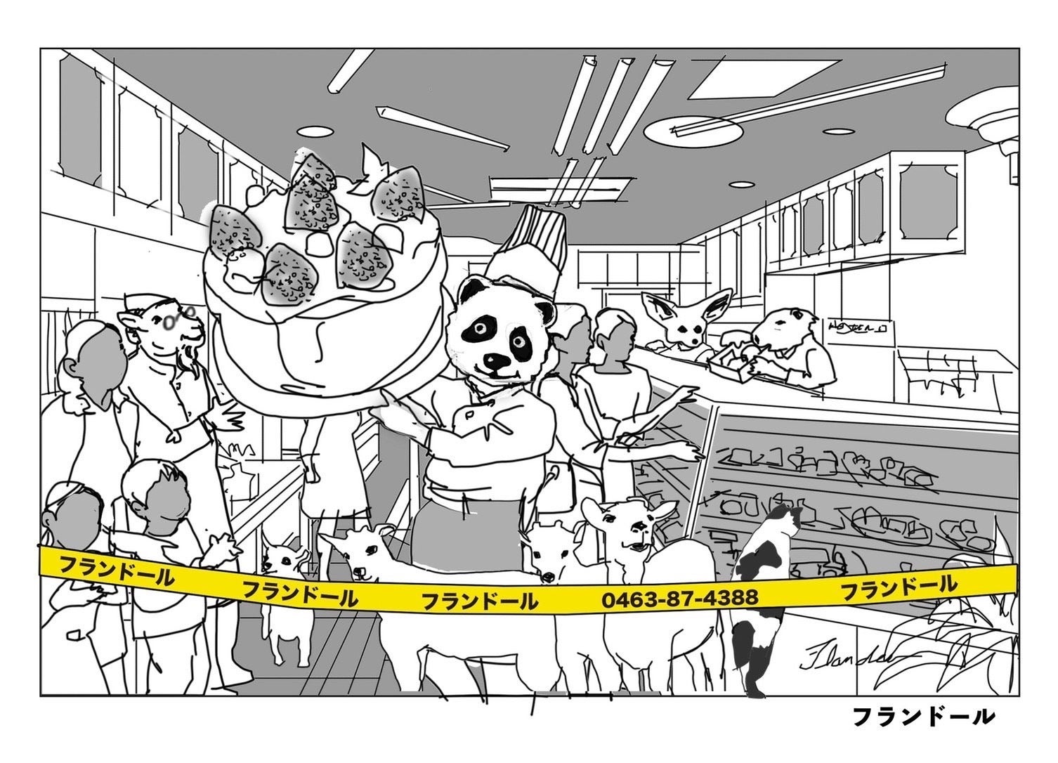 ①シャッターに店内を描くことで定休日などでもお店の様子を伝えられます。さらにそこにはクスッと笑える非日常が描いてあるので見る人も楽しい!