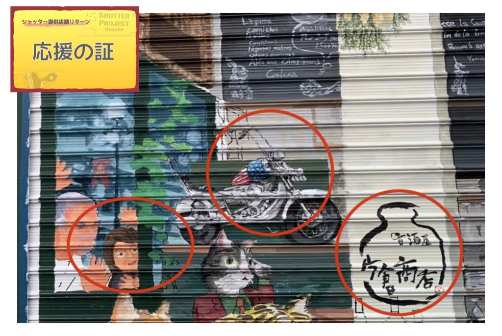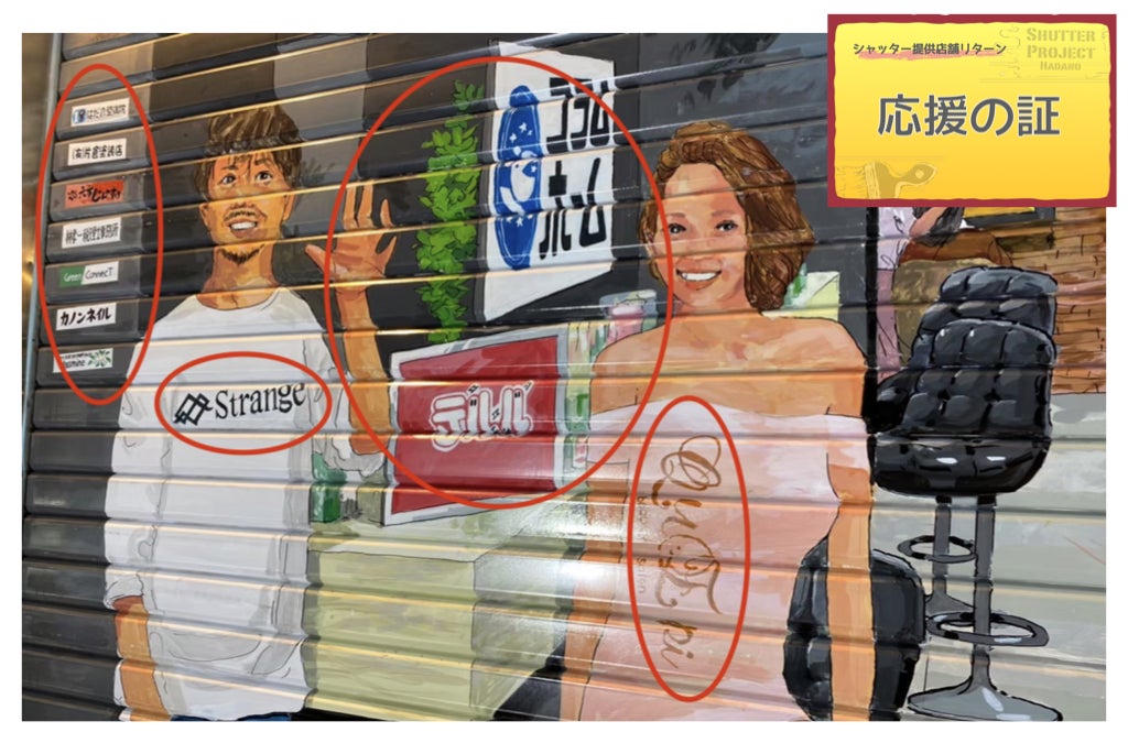 シャッターアートの中にそのお店のファンの方やお友達、取引先や企業のロゴやキャラクター、似顔絵などを描かせていただく『応援の証』というリターンがメインとなりwinwinの仕組みができあがっています。