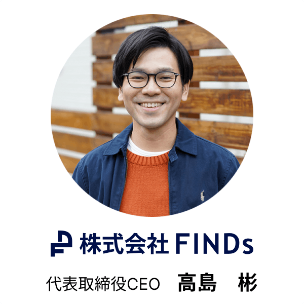 はじめまして!株式会社FINDs(ファインズ)代表の高島彬(タカシマアキラ)と申します。本ページを閲覧いただきありがとうございます。