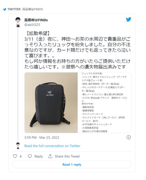 SNSを見てみると、多くの方が大切なものを落としてしまい、探されているのが見受けられます。無事に拾った人と繋がったケースは多くないのではないでしょうか。