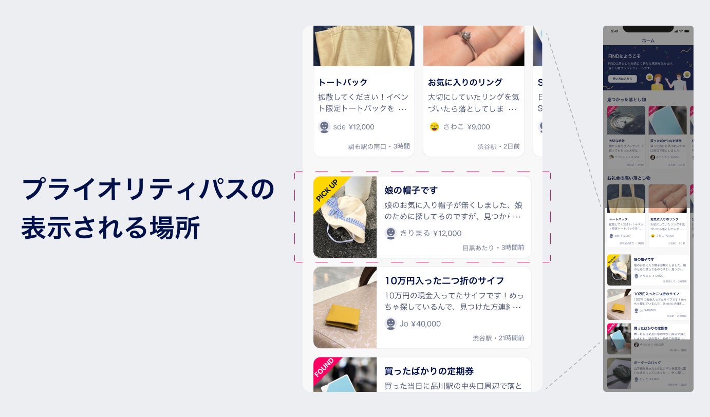 FINDは、落とし物に関する当事者の困りごとを解決するサービスです。しかしながら、落とし物をした時・拾った時それぞれのタイミングで、ユーザーがFINDを認知していないと世の中の落とし物情報が蓄積されず、落とし物を見つけられなくなってしまいます。そこで、本プロジェクトのご支援額を販促費に使わせいただき、ユーザー認知向上と、それによる利便性向上を実現させたいと考えております。このプラットフォームが機能するには「コミュニティ」の力が必要で、皆さまと一緒に「落とし物が必ず見つかる世界」を実現していければと考えております。