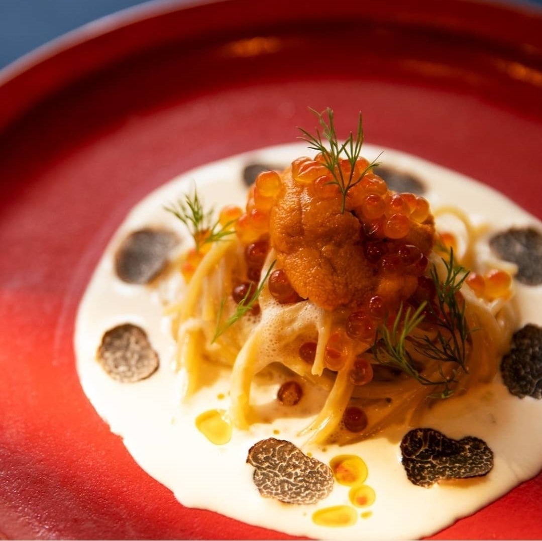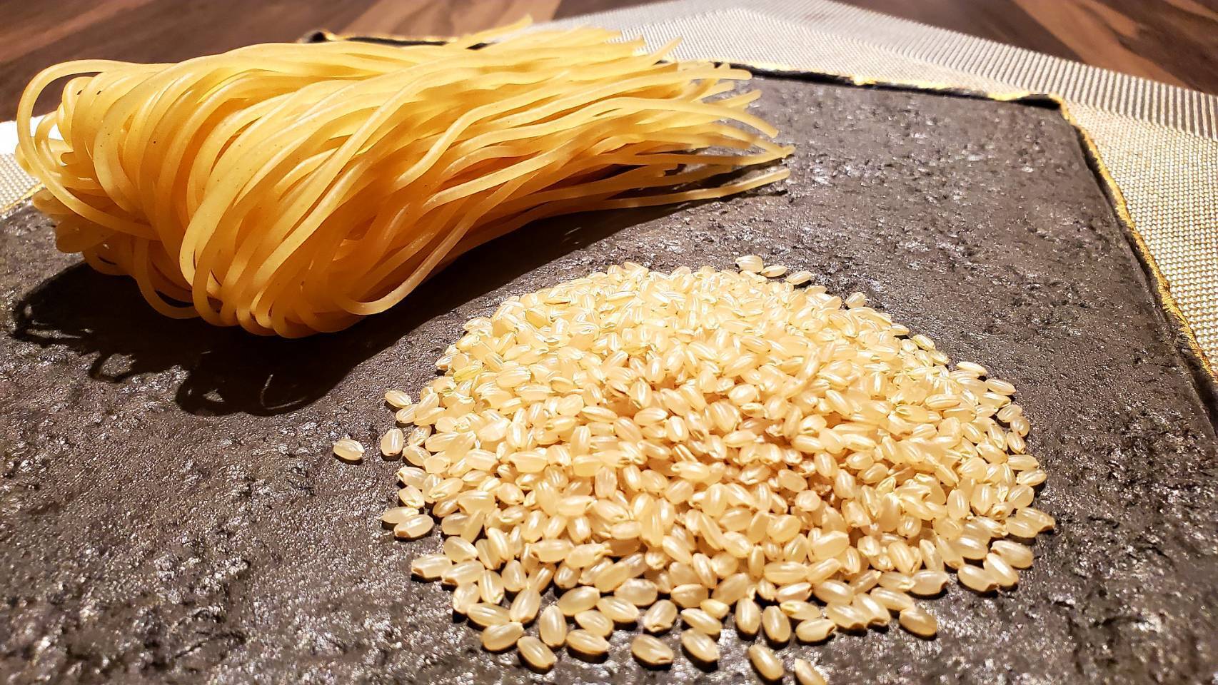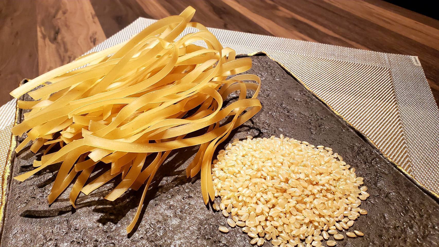 さらにイタリアンシェフとしては、麺類を得意とする山崎総料理長は、北海道倶知安町名物の「豪雪うどん」に注目しました。豪雪うどんはジャガイモのでんぷんからできているグルテンフリーの麺で、玄米粉と混ぜることでより美味しくなることを発見しました。