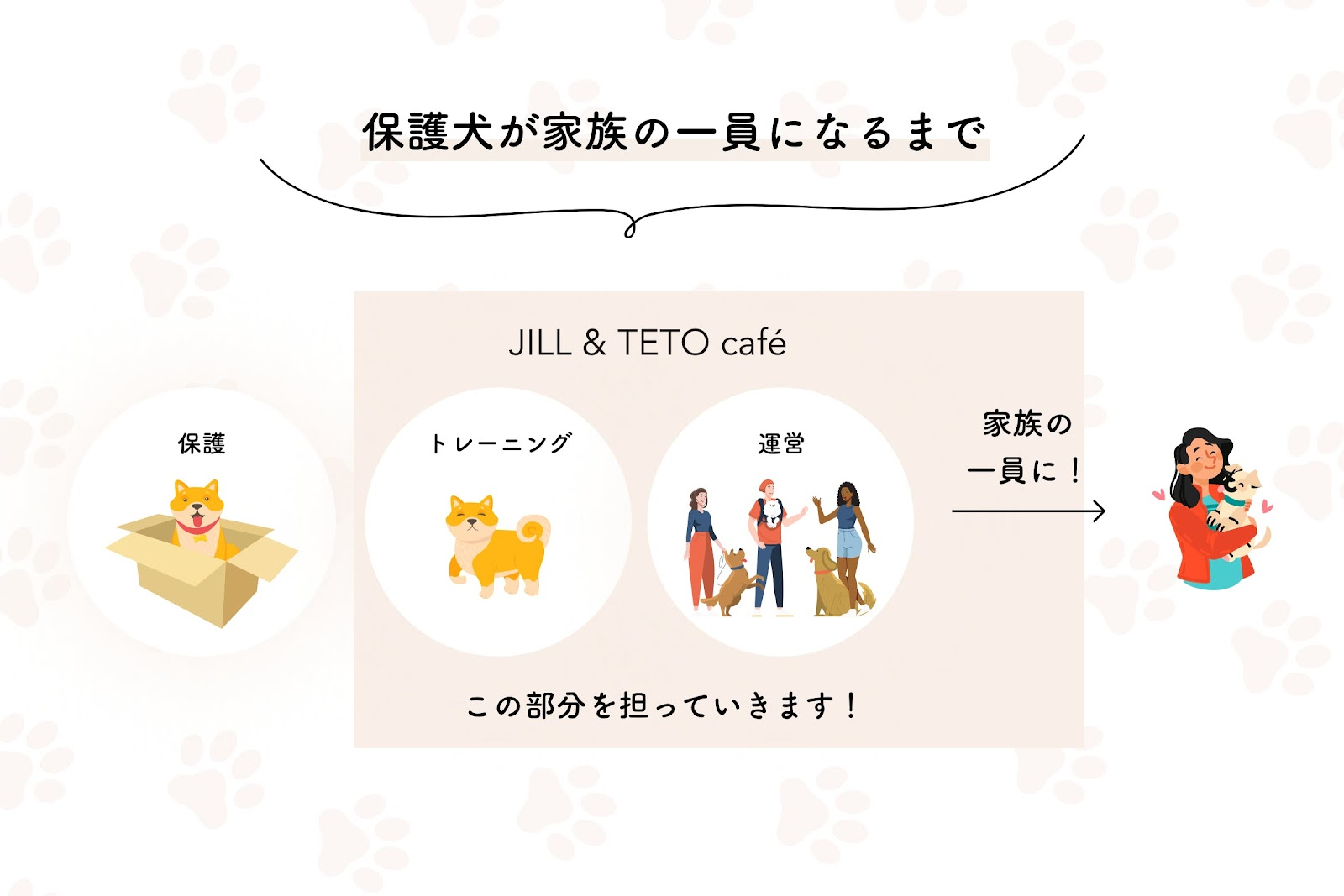 その時に、JILL & TETO caféで出会った元保護犬とその家族が、また一緒に来てもらうことができるようなカフェを作りたい。
