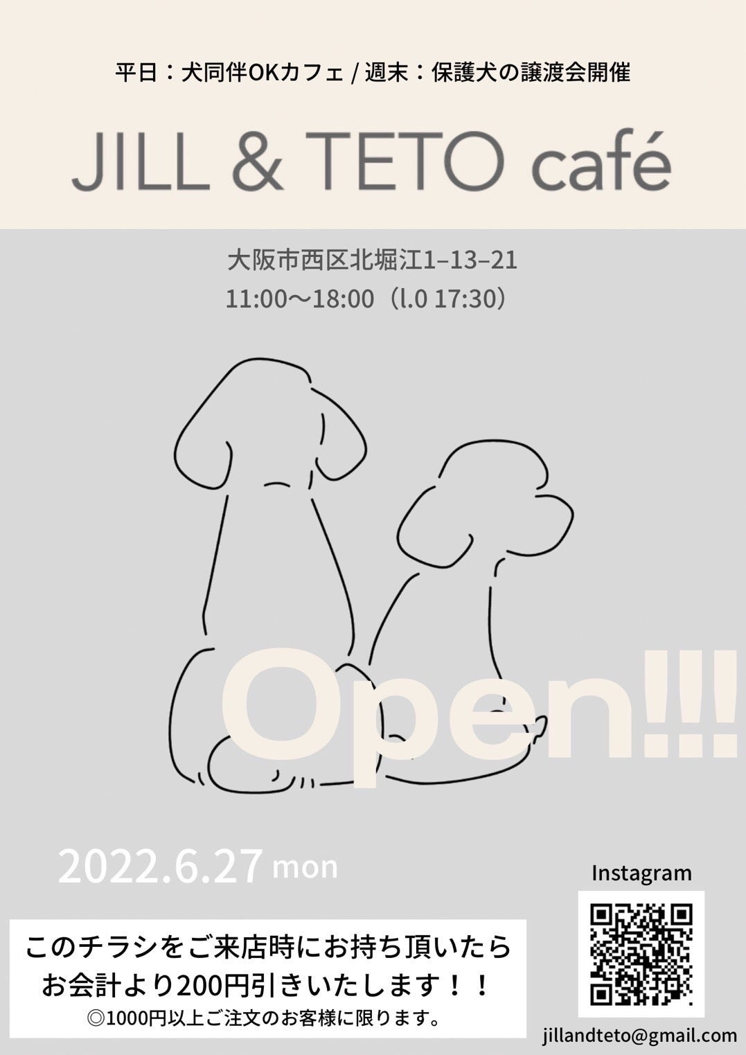 2022/06/20 11:22いつも応援してくださっている皆様お世話になっております。JILL&TETO café代表の木村鈴花です。6月18日・19日にプレオープンを予定しておりましたが、急遽工事やその他備品到着の遅延によりプレオープンおよび本オープンの日程を変更することが決定致しました。変更した各日程は以下の通りです。□プレオープン日程 6月18・19日→6月25・26日に変更 □本オープン日程 6月20日→6月27日に変更【住所】▷大阪府大阪市西区北堀江1-13-21【アクセス】・四ツ橋駅(四ツ橋線)から徒歩4分・西大橋駅(長堀鶴見緑地線)から徒歩5分・心斎橋(長堀鶴見緑地線)から徒歩10分【営業時間】▷11:00〜18:00(L.O 17:30)◎もちろんワンちゃん連れOK (近くにコインパーキングがあります。)プレオープンを楽しみにして下さり、事前に予定を空けてて下さった方には大変申し訳ない気持ちで一杯です。プレオープンを延期してしまった分、さらに素晴らしいスタートが切れるようにスタッフ一同全力で努力しますので、楽しみにお待ち頂けますと幸いです。JILL&TETO café代表木村鈴花・・・・・・・・・・・・・・・・・お問合せメール:jillandteto@gmail.com*InstagramのDMでのお問い合わせも可能です。→ https://instagram.com/jillandteto_cafe?igshid=YmMyMTA2M2Y= もっと見る