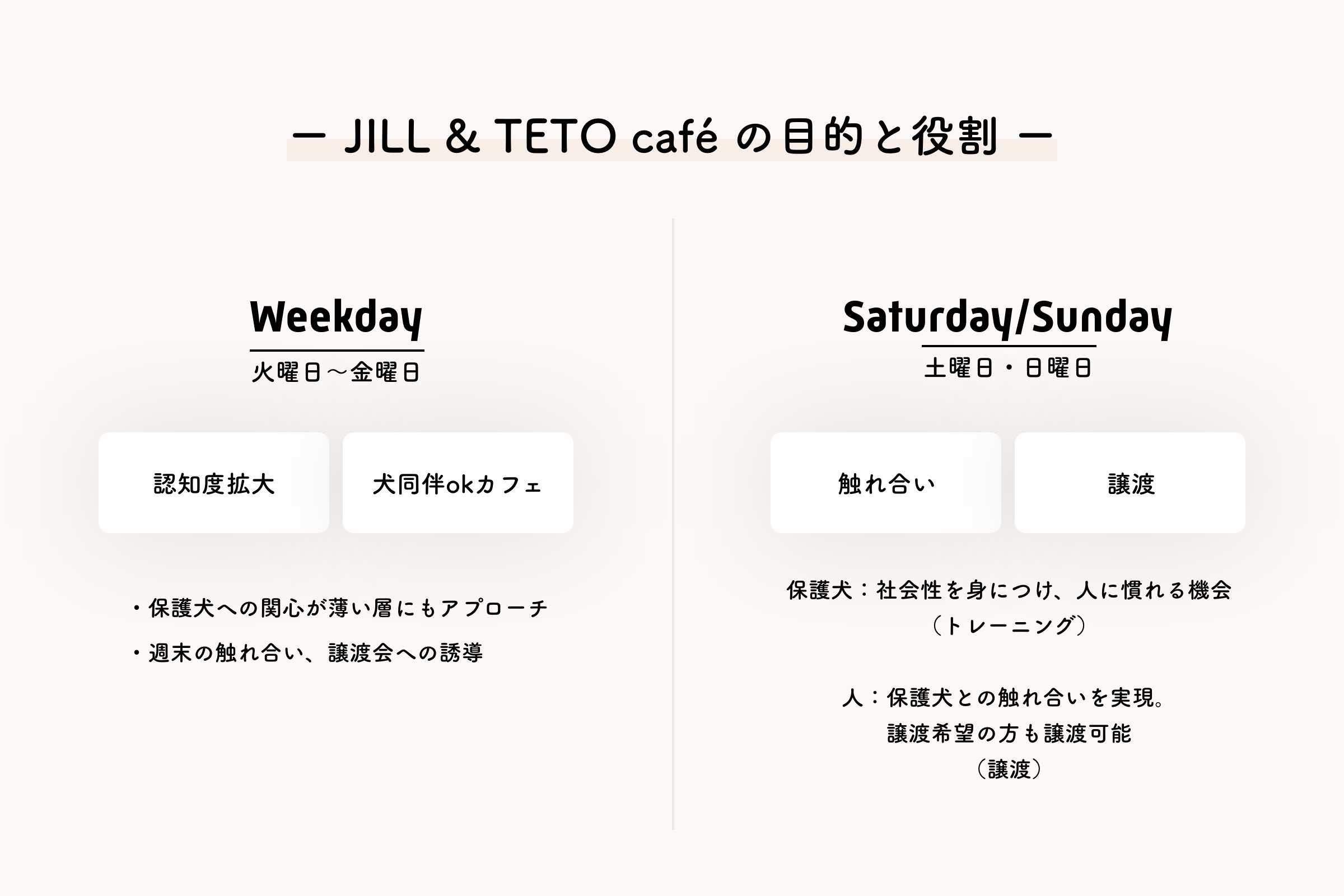 そして、そのカフェでは週末に保護犬の譲渡会やイベントを行い、より多くの方に保護犬のことをもっと知ってもらえるきっかけの「場所」を作りたいと思っています。