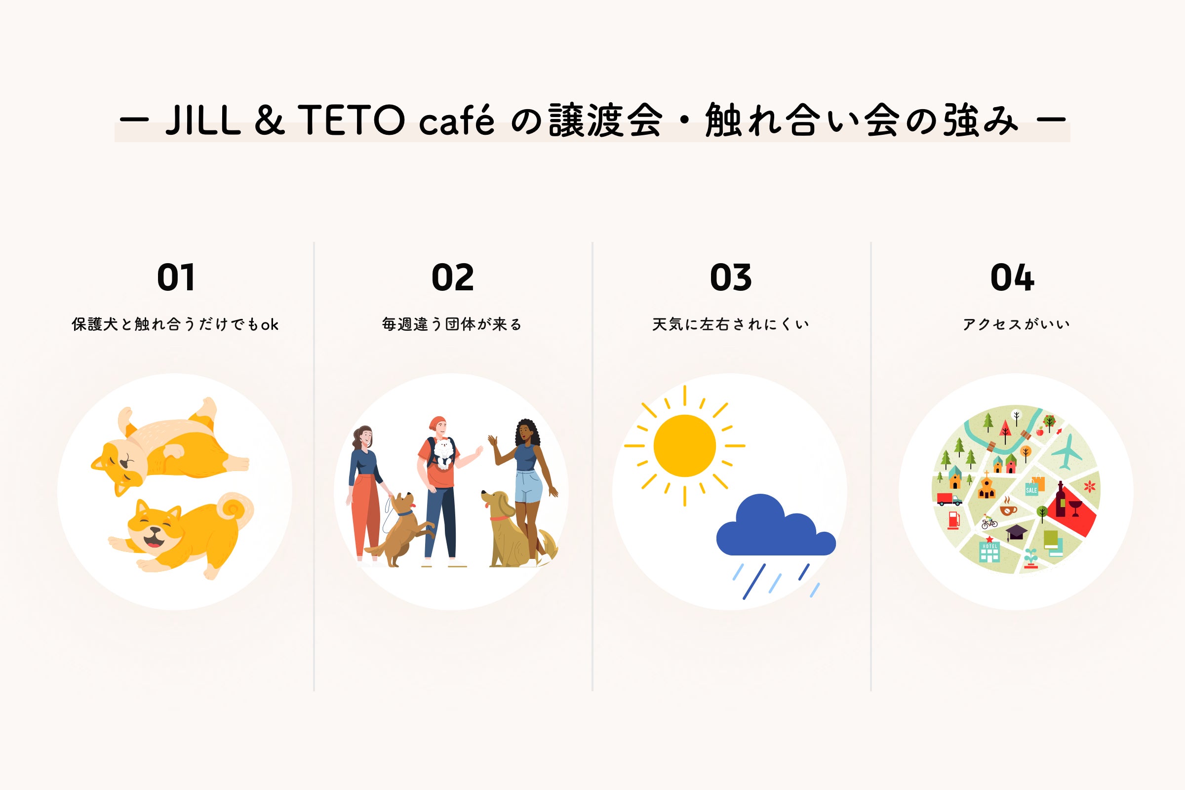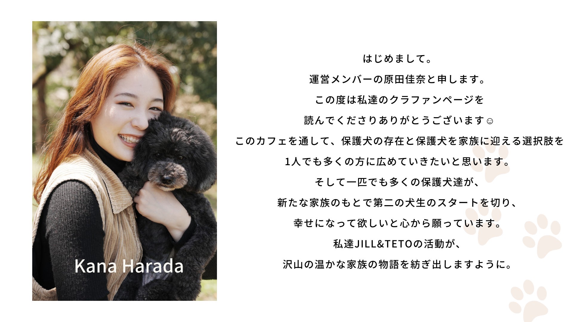 このカフェを通して、『保護犬』の存在を沢山の方に知ってもらい、新しい家族のもとで1匹でも多くのわんちゃんが心の底から安心して笑顔で幸せに暮らせるように、みなさんのご協力を頂きたいと思います。