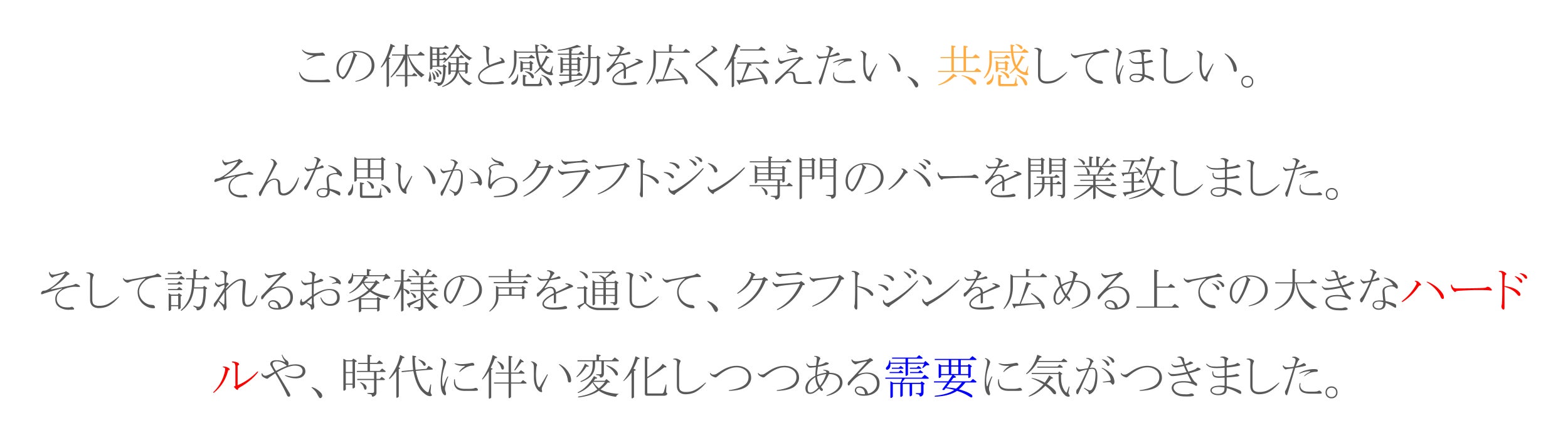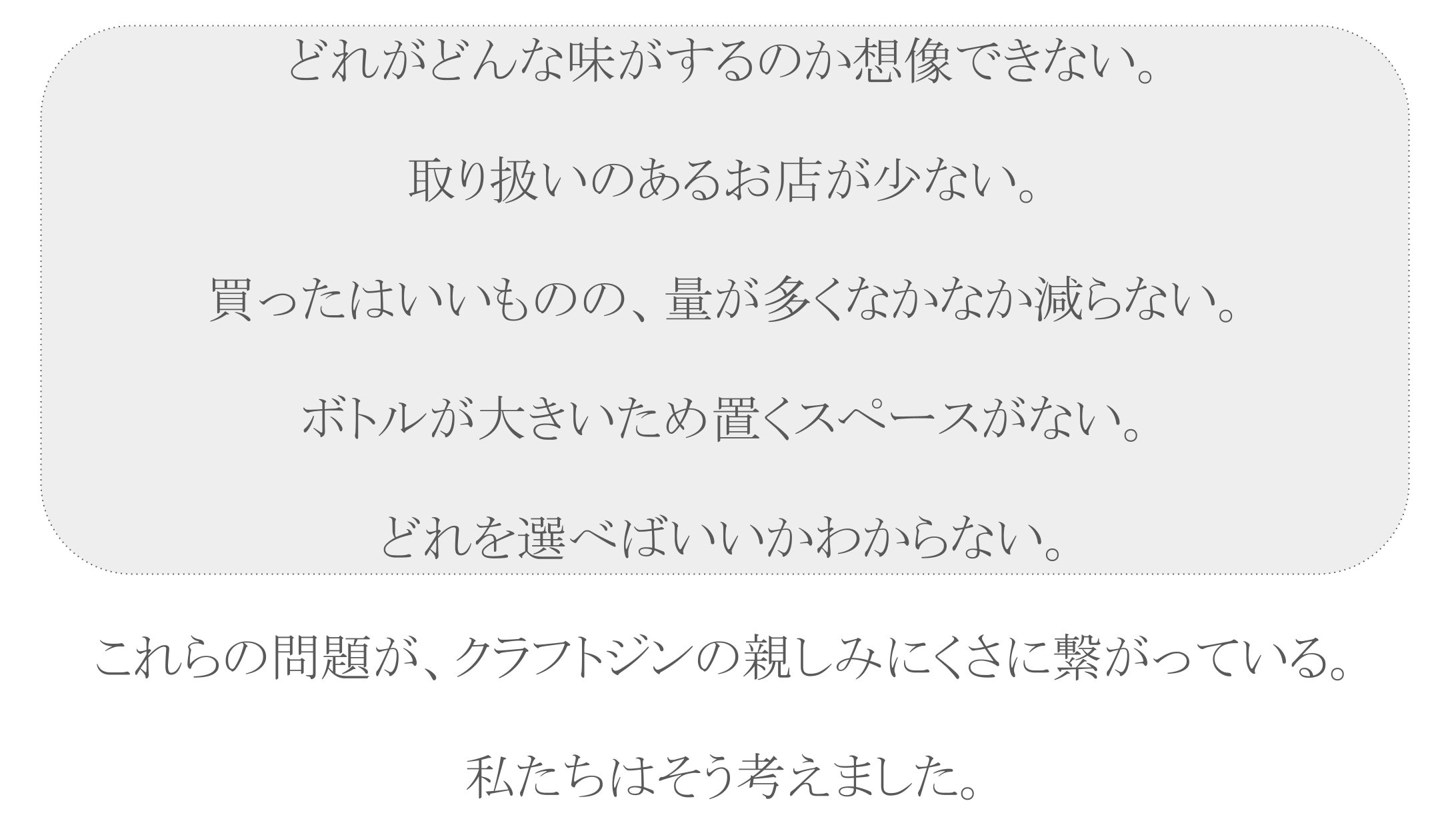 私たちは”気軽さ”を大切にしています。もっと気軽にジンを楽しんでほしい。友達や恋人にもオススメしやすい、そんなサービスを目指しています。
