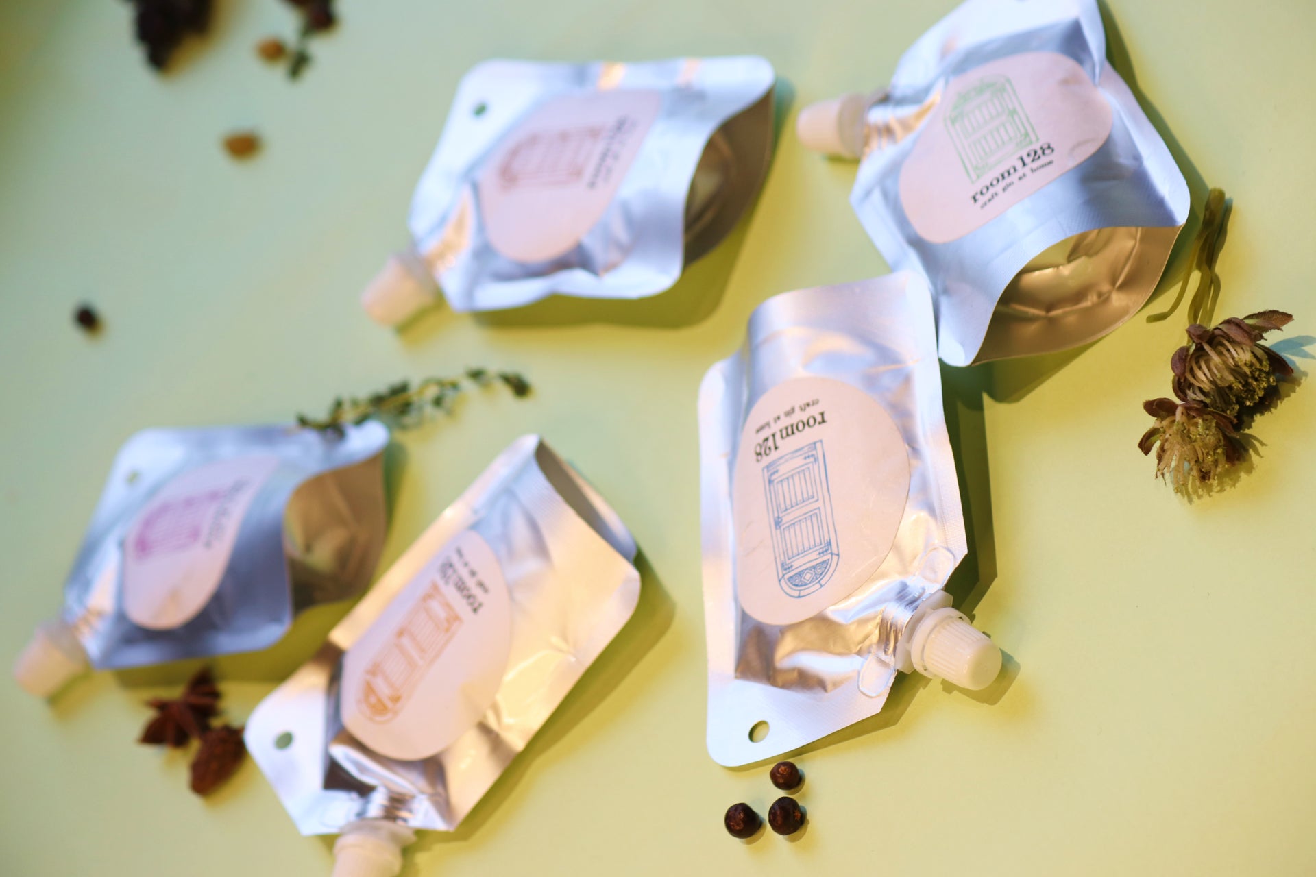 一般的なお酒のECサービスではプラスチックやガラスのボトルが用いられることが多いですが、room128においては環境保護の観点から、パウチ型容器を採用することで、排出されるゴミを最小限に抑えています。また梱包には再生紙生地の封筒を採用しています。
