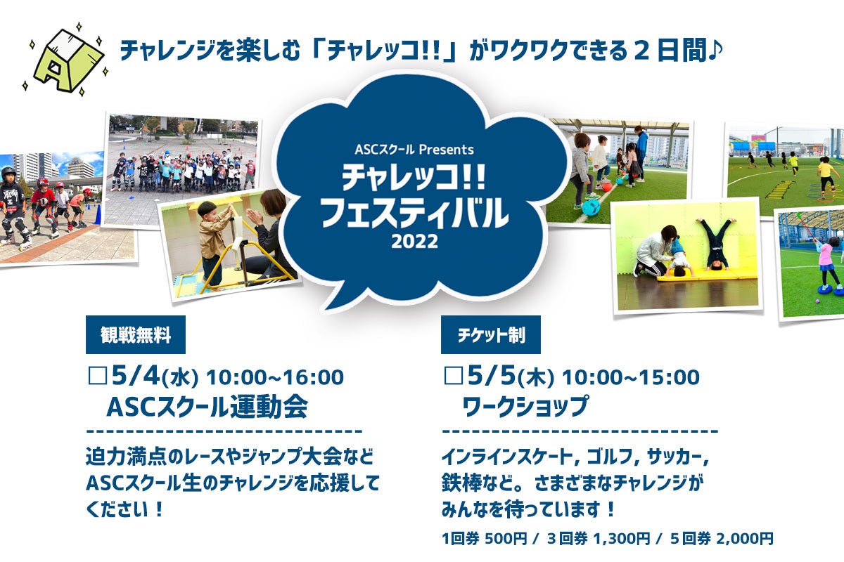 2022年5月4日(水)と5月5日(日)の2日間、神戸・六甲アイランドにてASCスクールが主催で「チャレッコ!! フェスティバル 2022」を開催いたします。第1回目となるこのイベントは「チャレンジとワクワク」をテーマに掲げ、コロナ禍によって後回しになっていたスポーツ体験を提供し、子供たちの成長を応援できるイベントを目指します。5月5日のワークショップでは、ASCスクールのプログラムに加えて子供たちがより豊富なスポーツ体験ができるように皆様からのご支援宜しくお願いいたします。