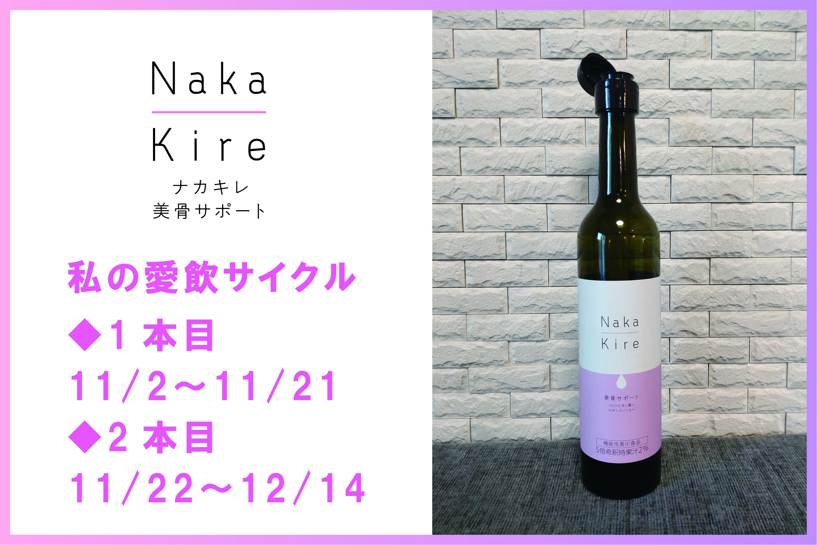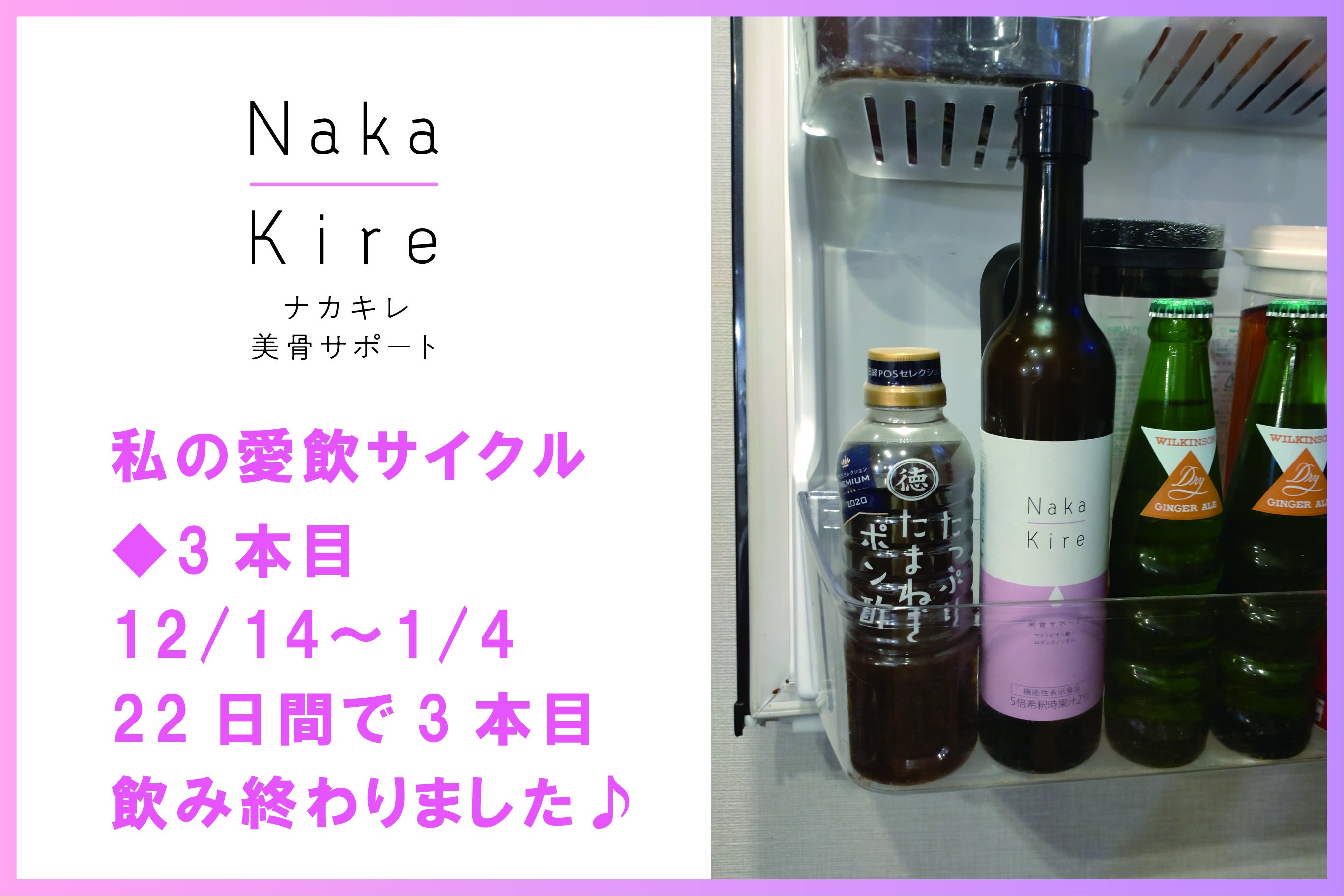 2022/12/15 16:00皆さま、ご無沙汰しております!季節もすっかり冬になり、昨日、今日とぐっと冷え込みましたね{{ (>_<) }}さて本日は私の愛飲レポートです!11/2(水)にリターン品が到着しまして早速その日の夜から愛飲開始♪まずは夜からスタートだったのでいつも飲んでいるピンクグレープフルーツチューハイで割ってみました♪そしたらフルーティーさが増してすごく美味!翌朝はトマトジュースで割ってみました♪これもフルーティーな風味がプラスされて美味しかったです☆☆☆それから毎日、水や炭酸で割ったり、牛乳でヨーグルトっぽくしたり、美味しいから1日2回飲む日もあったりで(*^▽^*;)11/21(月)の朝に1本目飲み終わりました♪1日摂取量目安20mlで内容量500mlなので基本は25日分なんですけど私は20日間で完飲(*゚∀゚)美味しいとこんなに自然と毎日続けられるもんだなーと改めて実感☆そして11/22(火)から飲み始めた2本目を昨日12/14(水)に完飲♪( ^_^)/□☆□\(^_^ )今回は23日間で飲みきりました!たまたまかもしれないですが飲み始めてしばらくたった頃に肌を褒められたことがあってとーっても嬉しかったです♪2本セットのリターン品を選ばれた方が結構おられたのでそろそろ飲み終わるタイミングなのではないでしょうか?そんな方はぜひ↓こちらをクリック♪→→→定期購入のお申し込みはコチラ♪初回半額&プレゼント付き、注文し忘れがないお得な定期購入がオススメです☆もちろんその都度注文でも大丈夫です♪→→→単品購入やまとめ買いをされたい方はコチラ♪美味しくて毎日続けやすい「ナカキレ美骨サポート」で骨の健康も美肌も叶えて、更年期を乗り切りましょう!Naka-Kire美骨サポート開発チーム一同 もっと見る