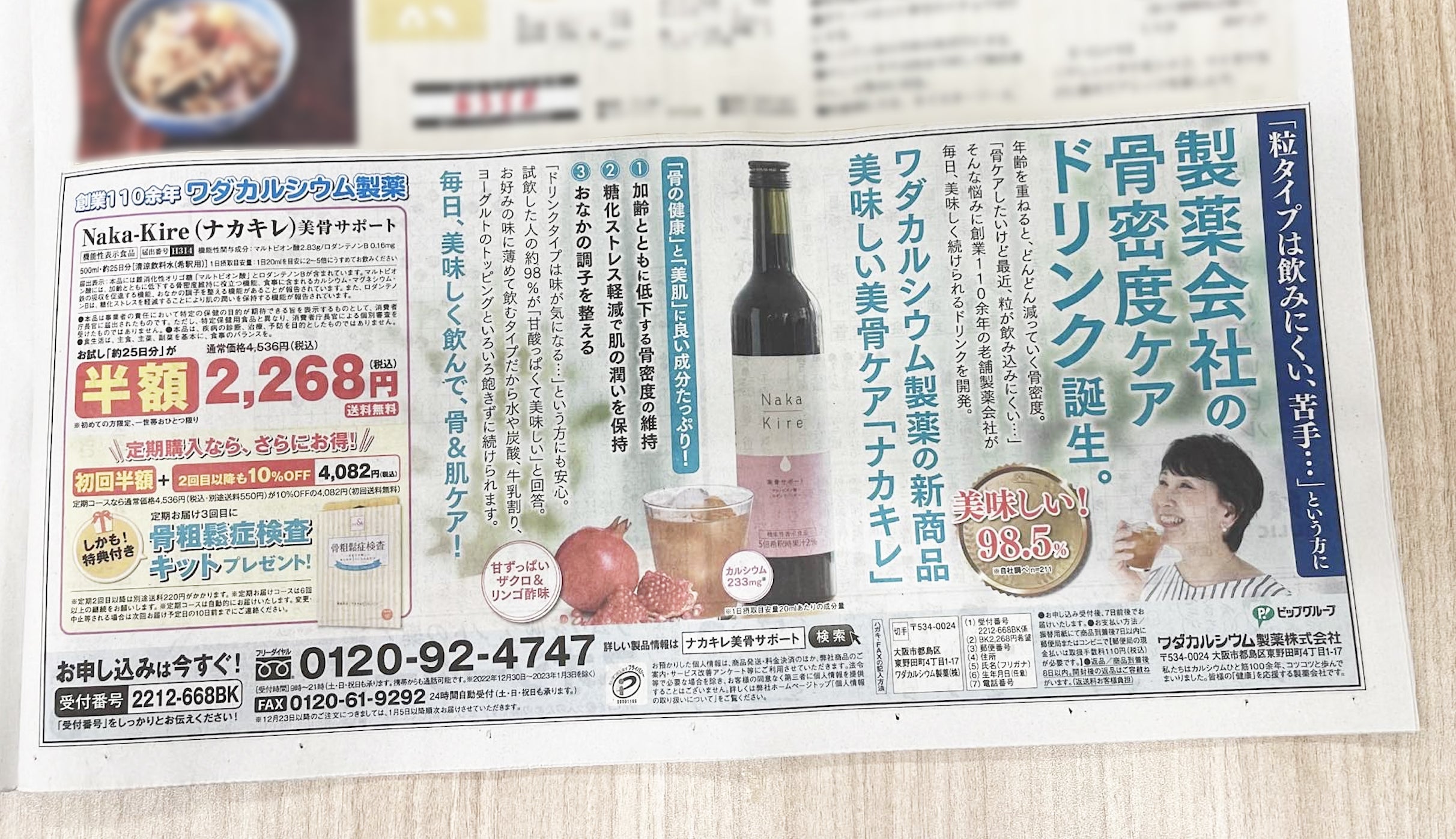 2023/01/25 16:32皆さん、こんにちは!昨日、今日と最強寒波でとんでもなく寒くって{{ (>_<) }}エアコンずっとつけちゃうから空気が乾燥して潤いが不足しがちですね…こんな日はナカキレ美骨サポートをぜひホットでお飲みください♪骨密度の維持と肌の潤いをWでケアできるナカキレ美骨サポートをより多くの皆さまに知っていただけるように昨年末から新聞広告の掲載もはじめています。そして、定期購入の特典がさらに充実しました!なんと定期購入3回目で「骨粗鬆症検査キット」をプレゼントいたします♪この検査キット、気になる骨粗鬆症の危険性を自宅で採尿して検体を郵送するだけでチェックできる優れモノです!私の愛飲も1/23に3本目を飲み終わり、すでに4本目に突入しております!リターン品を飲み終わったら私も定期購入をはじめて骨粗鬆症検査してみたいと思います!もうそろそろ飲み終わる方おられましたらぜひお得で特典いっぱいの定期購入をどうぞ!→→→定期購入のお申し込みはコチラ♪もちろんその都度注文でも大丈夫です♪→→→単品購入やまとめ買いをされたい方はコチラ♪甘ずっぱくてフルーティなザクロ&リンゴ酢味でホットでもアイスでも美味しいナカキレ美骨サポートで厳しい季節を潤いたっぷりで乗り切りましょうね!ワダカルシウム製薬ナカキレ美骨サポート開発チーム一同 もっと見る