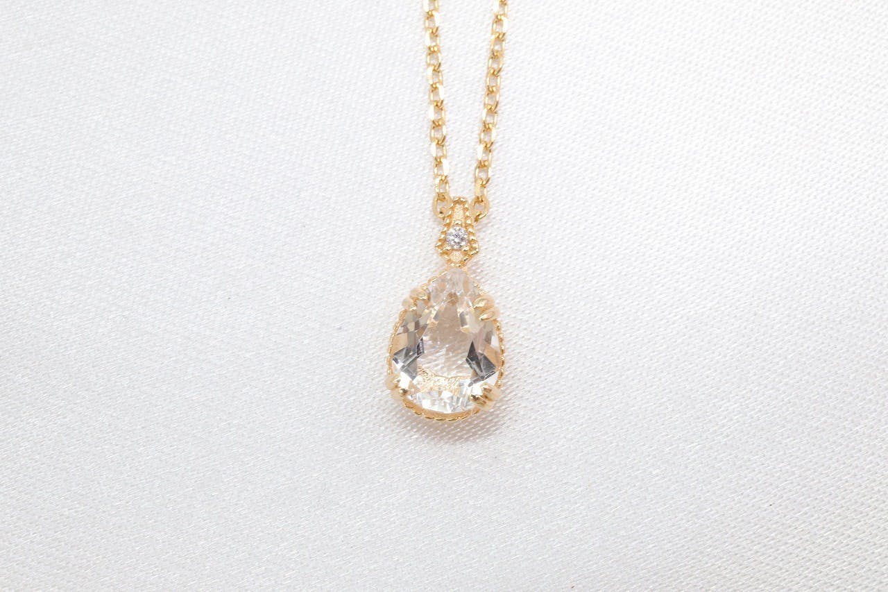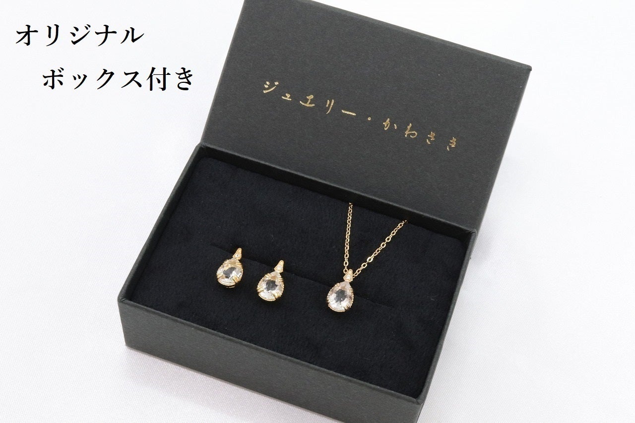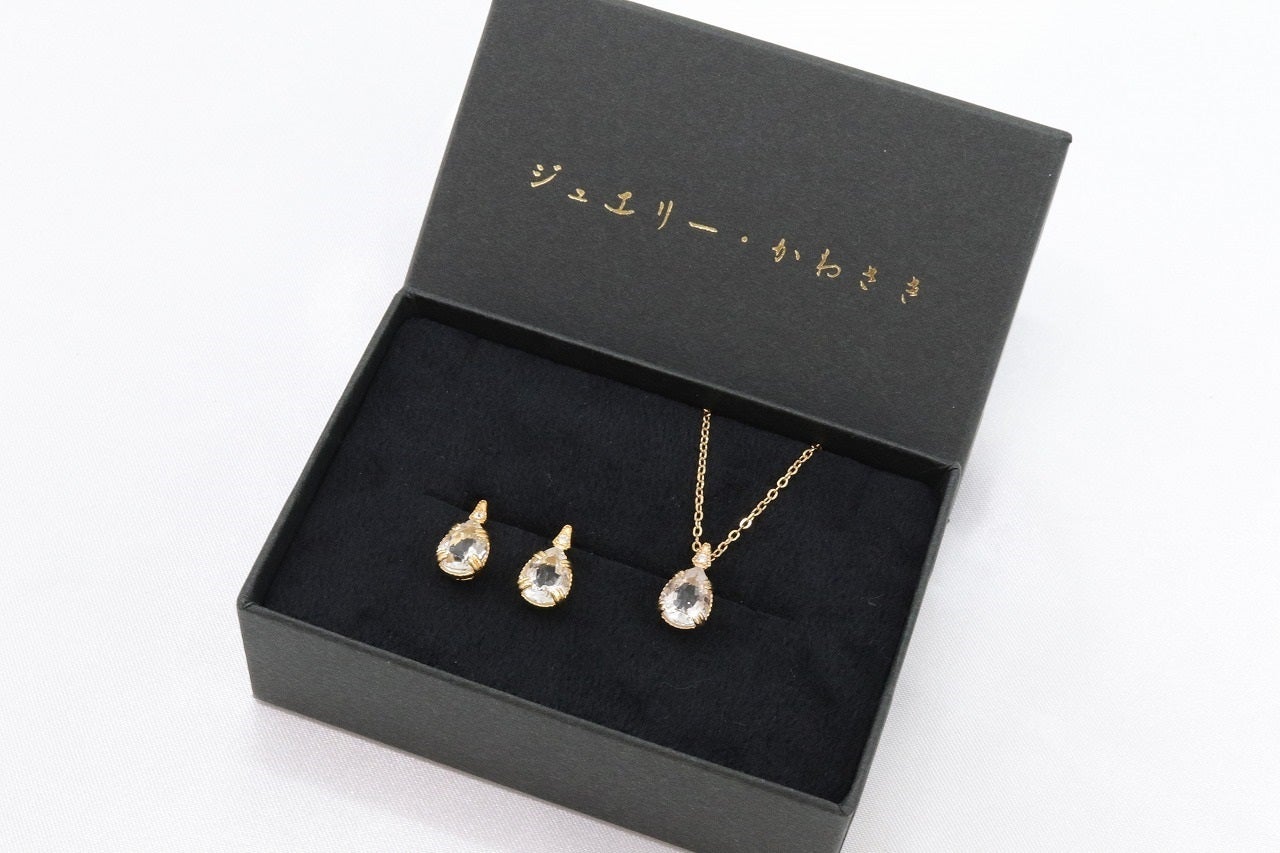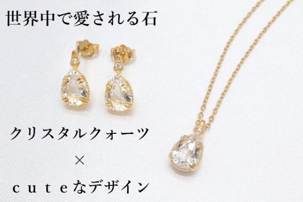邪念をはねのけ、成功へと導いてくれる効果が期待できる「クリスタル」で、可愛らしいデザインのネックレスとピアスをご用意させていただきました。素材は、Silver925(18KGP)となります。