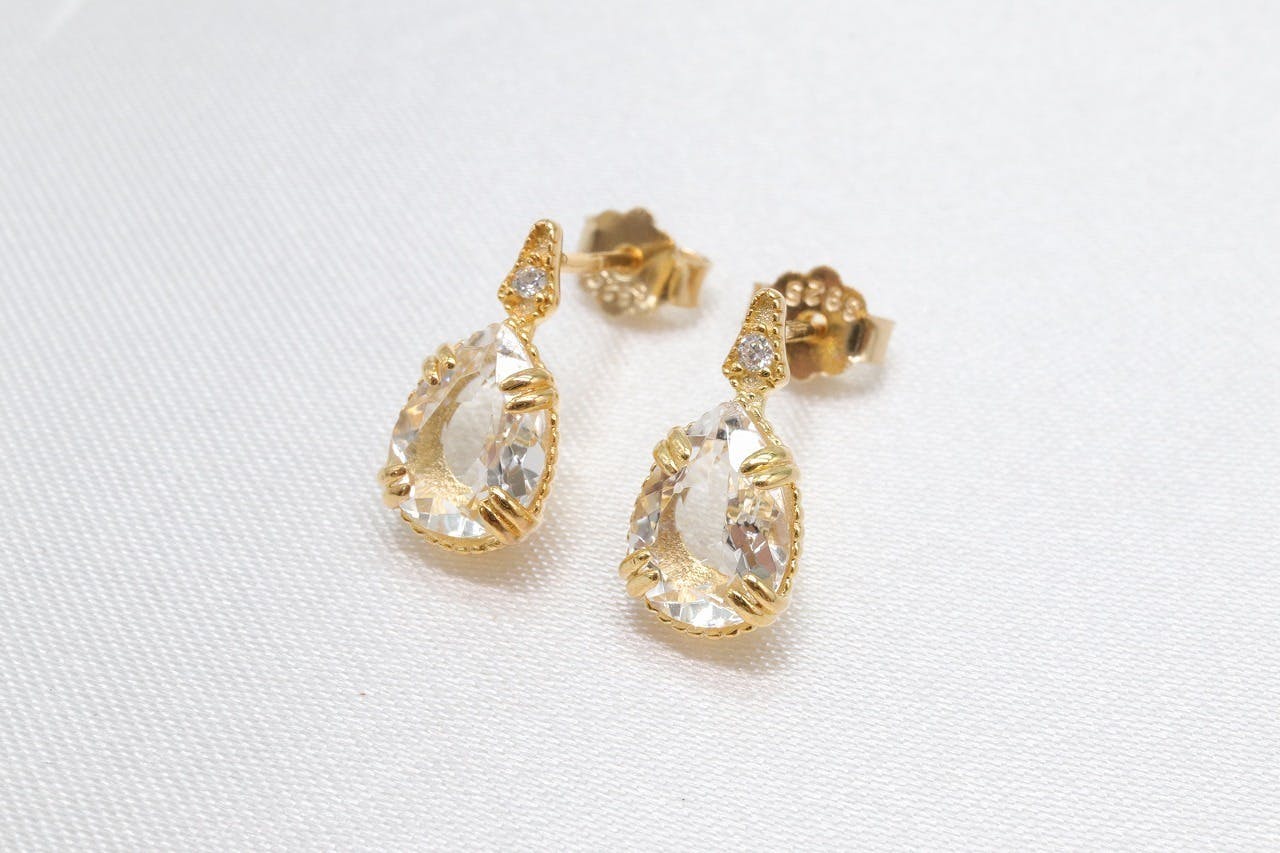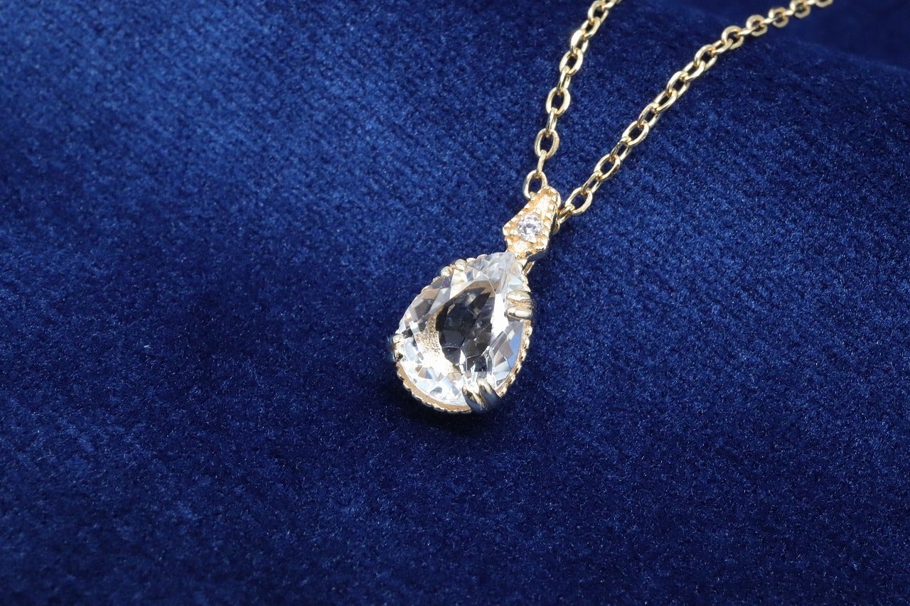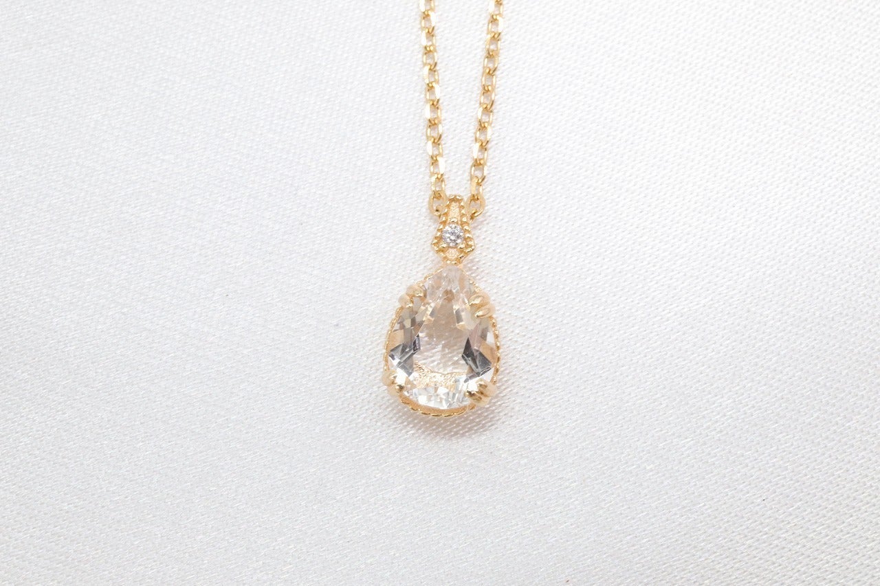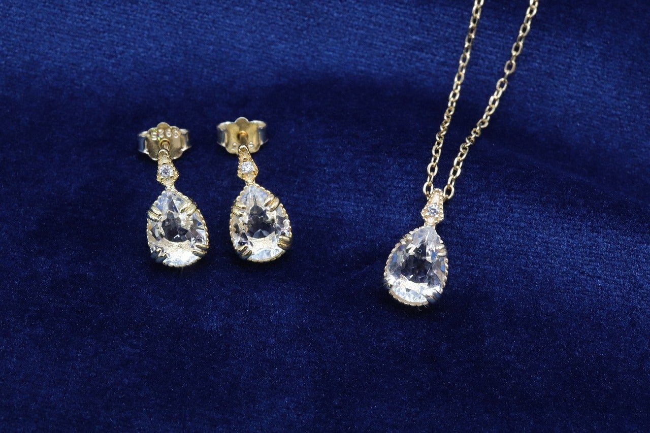 邪念をはねのけ、成功へと導いてくれる効果が期待できる「クリスタル」で、可愛らしいデザインのネックレスとピアスをご用意させていただきました。素材は、Silver925(18KGP)となります。