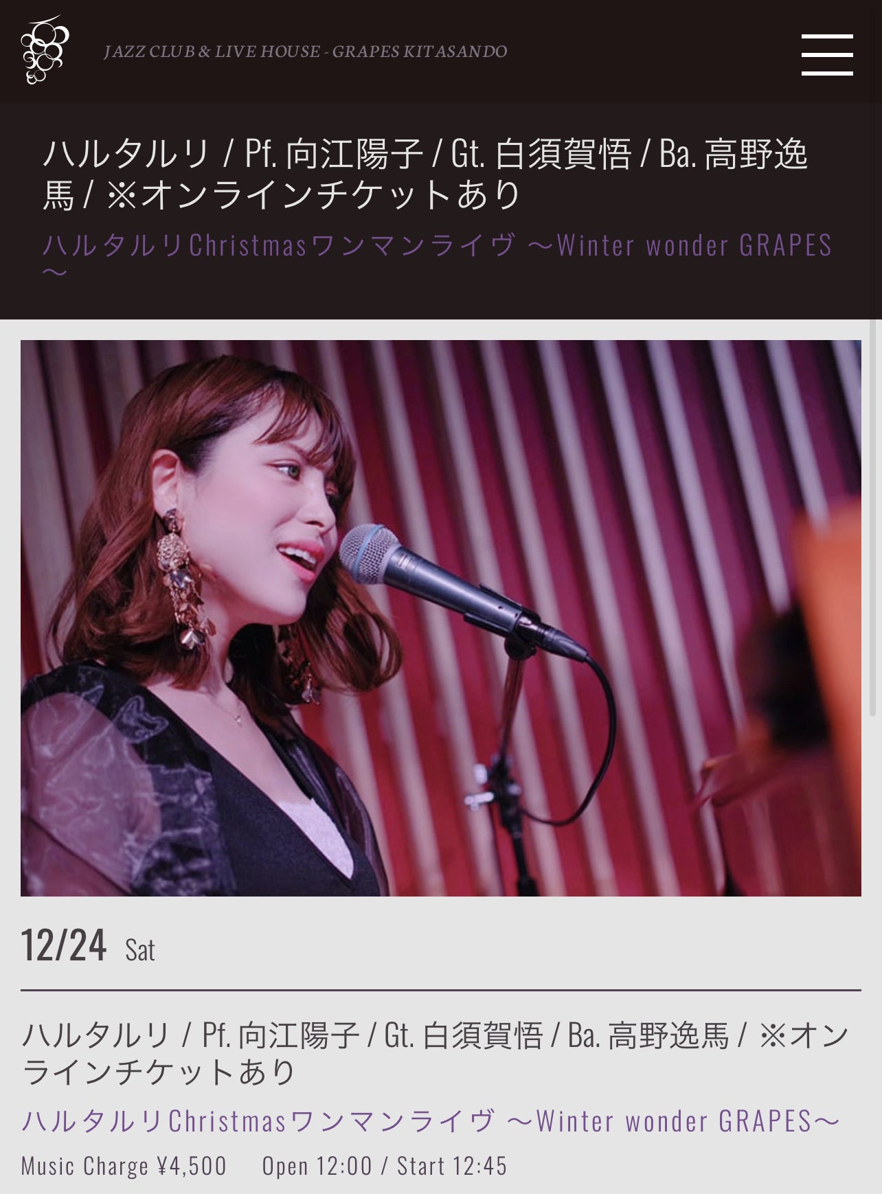 ワンマンライブまであと二週間となりました!年内ラストのライブ、満員でおわりたいです! ハルタルリ Pf. 向江陽子 / Gt. 白須賀悟 / Ba. 高野逸馬 ※オンラインチケットあり ハルタルリChristmasワンマンライヴ 〜Winter wonder GRAPES〜 Music Charge ¥4,500 Open 12:00 / Start 12:45 残り10名ほどご予約できます!rurissongs@gmail.com