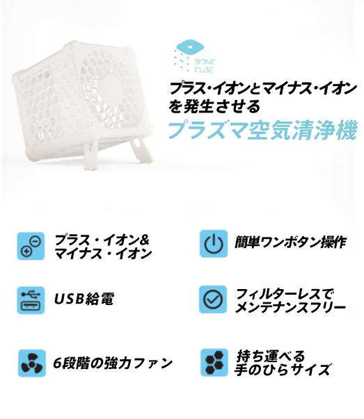 【Bionic Cube】は米国人パイロットが開発したプラズマイオン空気清浄機です。 プラズマイオン(プラス&マイナスイオン)式はプライベートジェットで採用されていて、それを応用して誰でもどこにでも持ち運べるようにしたのが【Bionic Cube】です。 Blake氏は「誰でもキレイな空気を手に入れる権利がある」という信念のもと、Gulfstreamのエンジニアであった父親と一緒に開発しました。