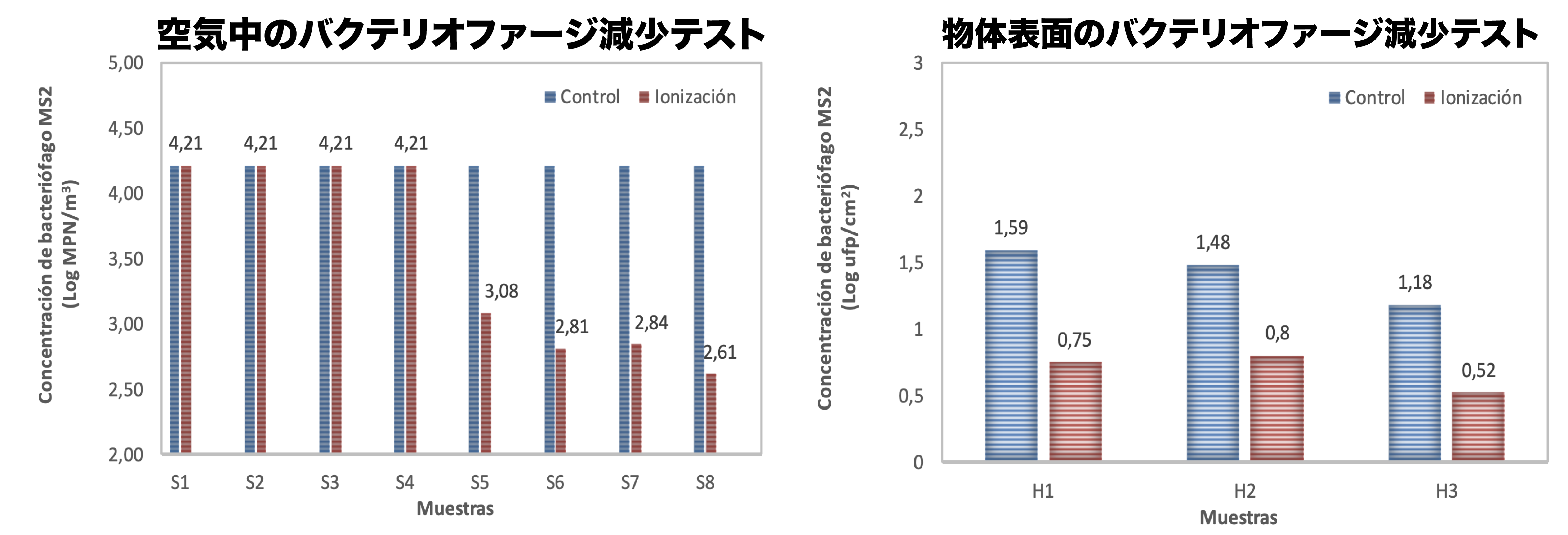 MS2バクテリオファージを利用した試験では、27㎡ (約15畳) の部屋を10分程度で99%浄化することが証明されました。