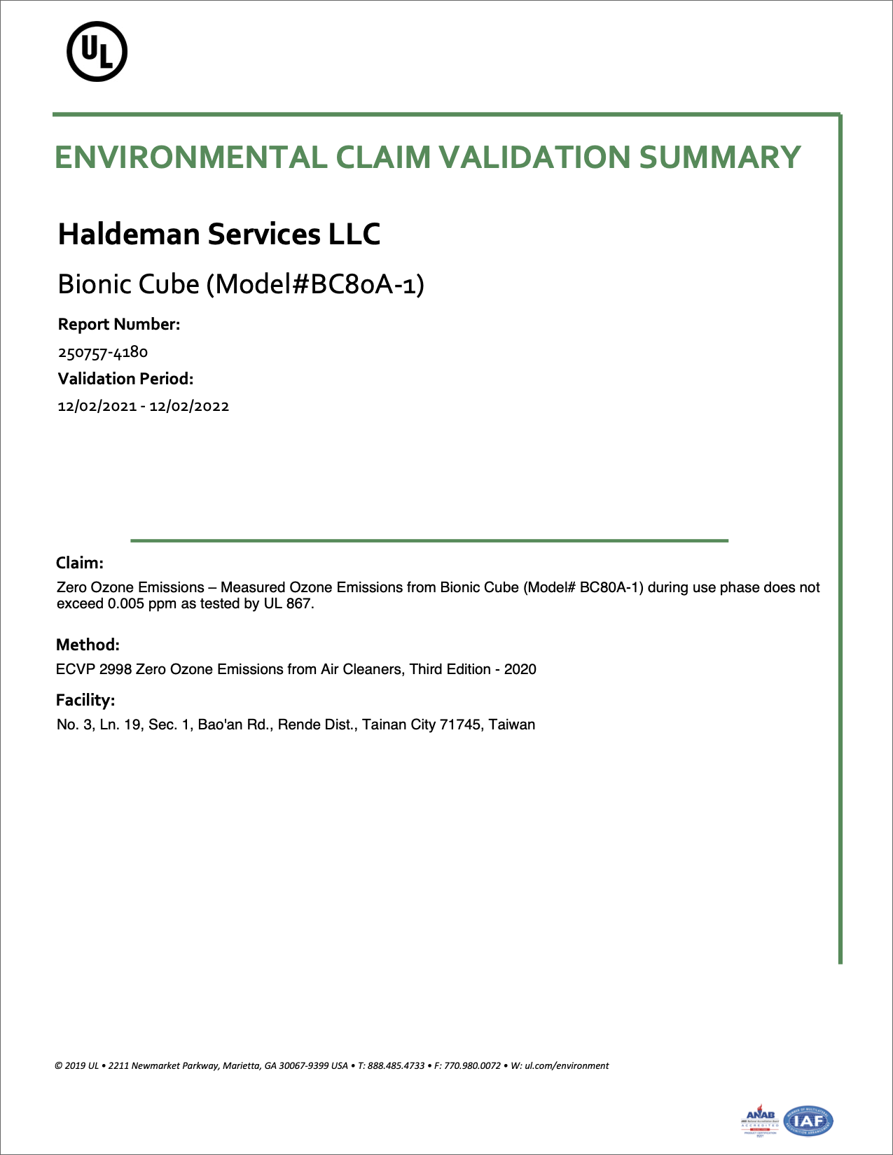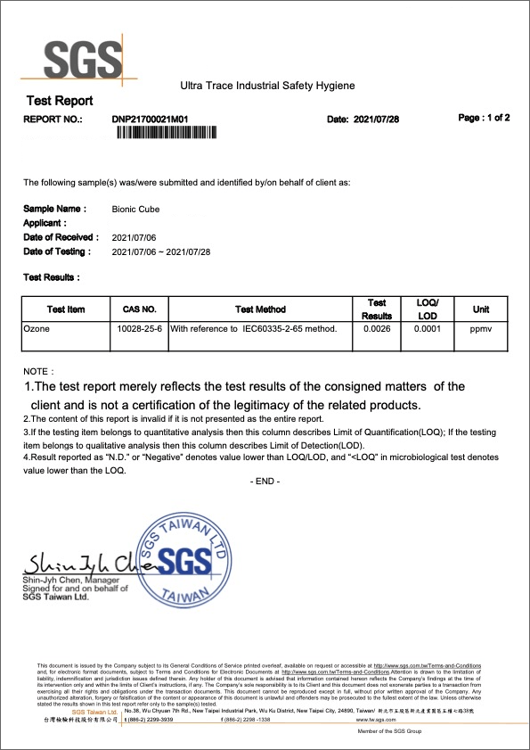 一般的なバイポーラ(プラス・マイナス)イオン化装置は副産物として有害なオゾンが発生することがありますが、【Bionic Cube】は国際検査機関であるSGSの試験でオゾンの発生量が0.0001ppmv (ppmvは百万分の1) と限りなく ”0”に近い数値であることが証明されていて、ULでも「ゼロ・オゾン」として認定されています。
