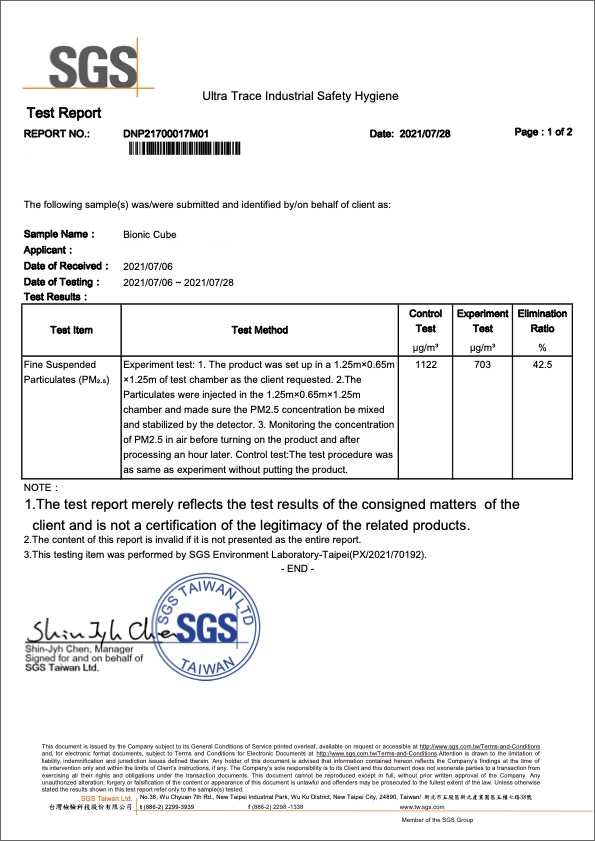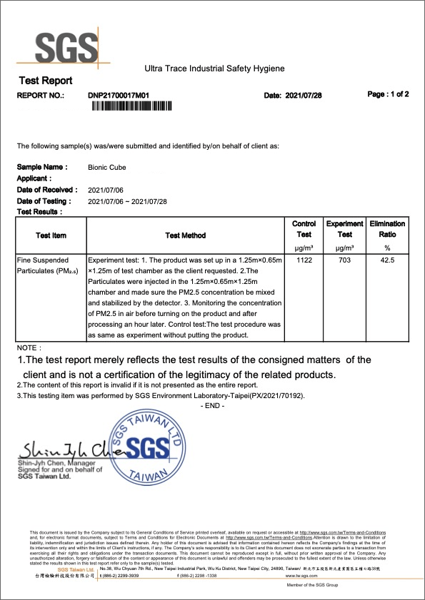 国際検査機関SGSにて試験を行いPM2.5を空気中から減少させることを証明しています。