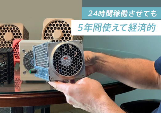 イオン発生機とファンとモーターの単純な構造ですので耐久性が高く、24時間365日で計算すると5年間使用できるようになっています。