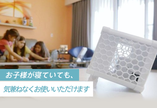 最大モードでも42dBと静かな図書館並みの静けさです。音に敏感な小さなお子様が寝ていても、気兼ねなくお使いいただけます。