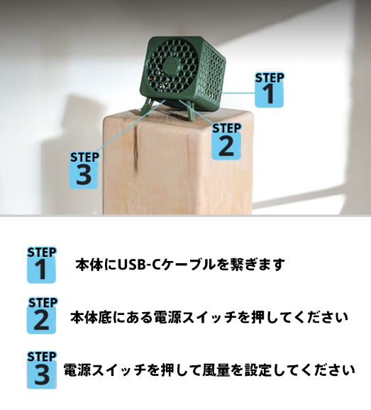 A:とても簡単にご使用いただけます。付属のACアダプターまたはUSBケーブルを本体につないだ後、電源ボタンを押して風量を設定するだけです。風量は6段階に変えられます。