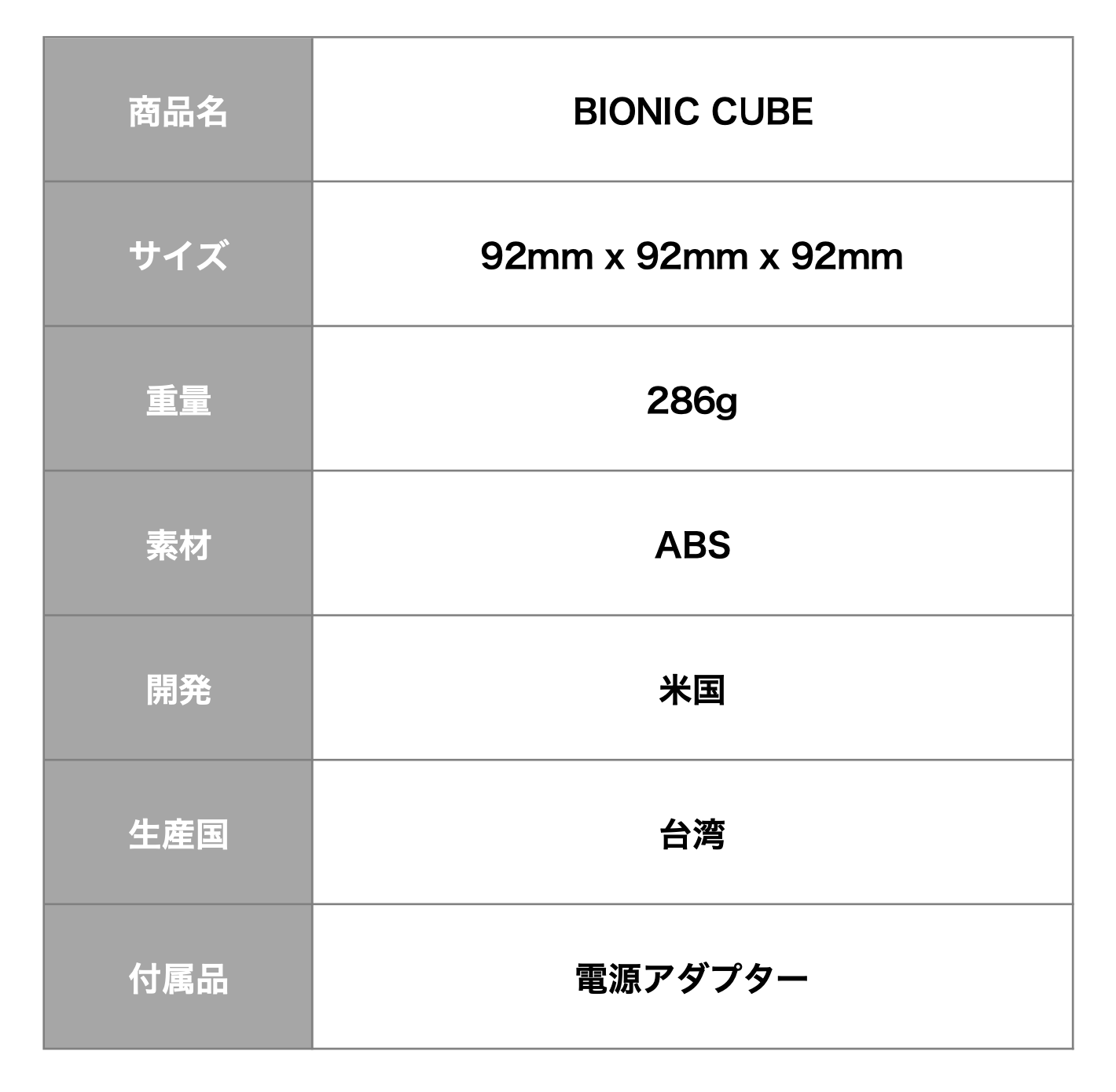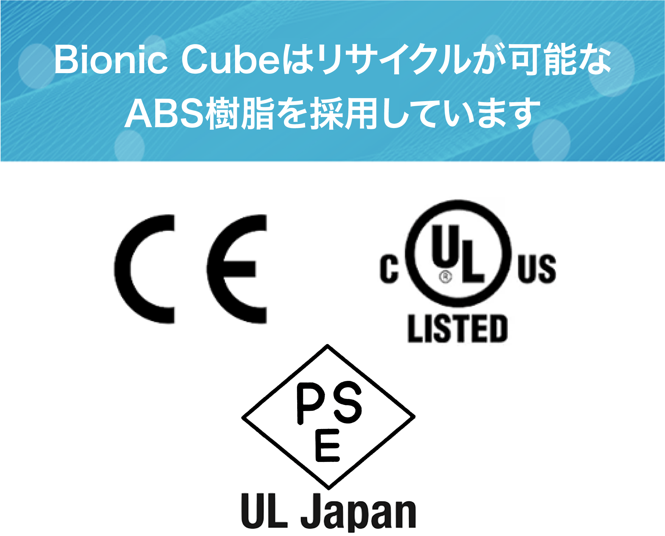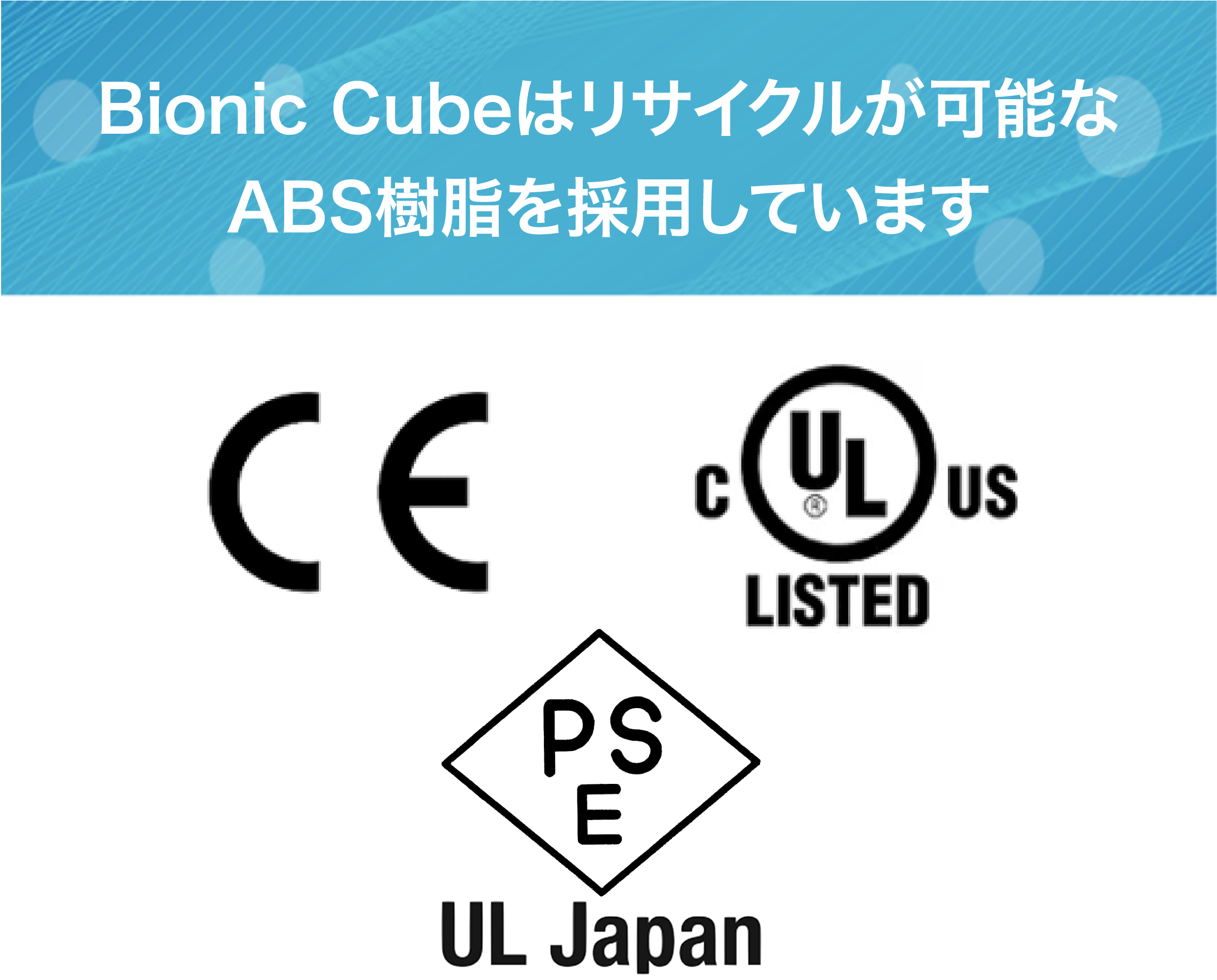 【Bionic Cube】は軽量化を図るため耐衝撃性に強いABS樹脂を使用、リサイクルが可能なABS樹脂を使用しております。また、CE認証やUL認証を受けており、人や環境に配慮した設計をしています。付属する電源アダプターは日本の電気用品安全法に合致したPSEマーク付きです。
